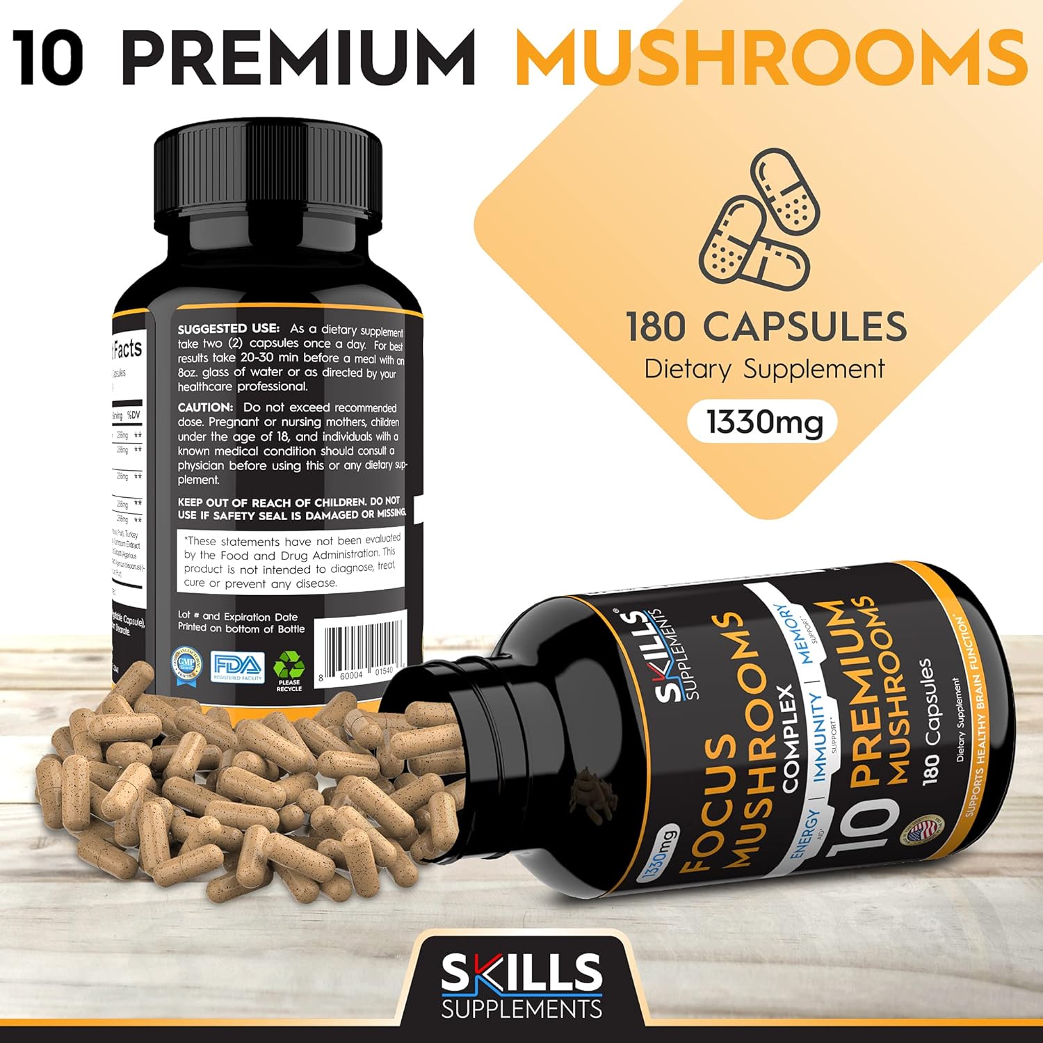 Skills Mushroom Supplement – Lions Mane, Cordyceps, Reishi, Shiitake and More – 180 Capsules – Nootropic Brain Supplement, Complex Formula for Immunity, Stress Relief, Memory & Liver Support