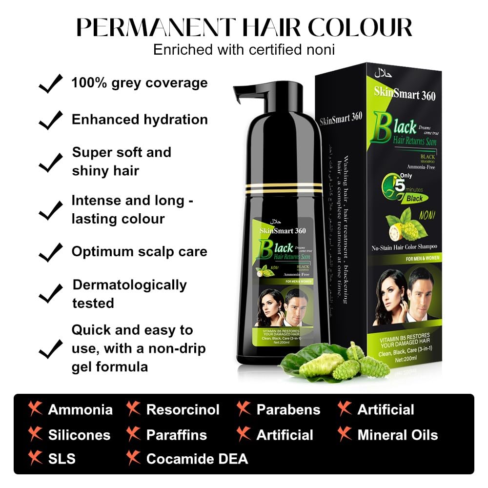 SkinSmart 360 Instant Hair Coloring Shampoo for Men & Women, No-Stain on Skin & Scalp, 100% Gray Coverage, Plant-Based Ingredients, Easy No-Mix Application, 200 mL, Pack of 1 (Natural Black)