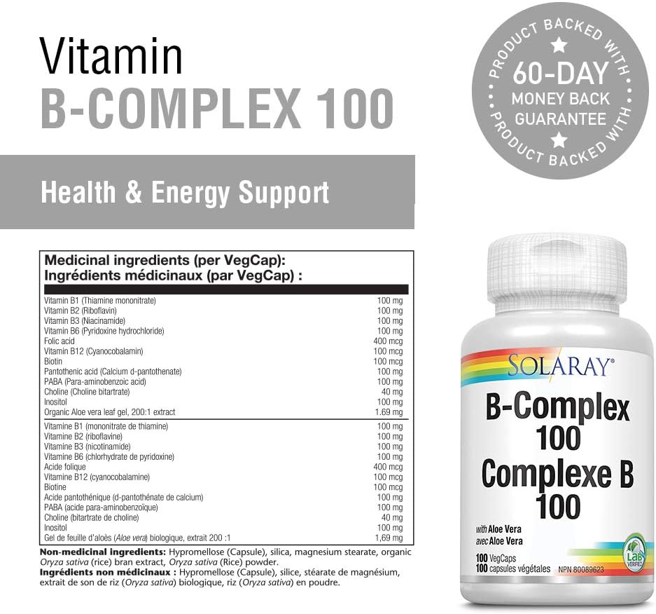 𝗘𝗡𝗘𝗥𝗚𝗘𝗧𝗜𝗖, 𝗛𝗘𝗔𝗟𝗧𝗛𝗬 & 𝗕𝗥𝗜𝗚𝗛𝗧 – Get everything you need with Solaray B-Complex 100 – a combination of all eight B vitamins, in one, powerfully simple serving. B-complex vitamins help support healthy hair and skin, normal nerve impulse transmission, immune system function, and healthy red blood cell formation.
