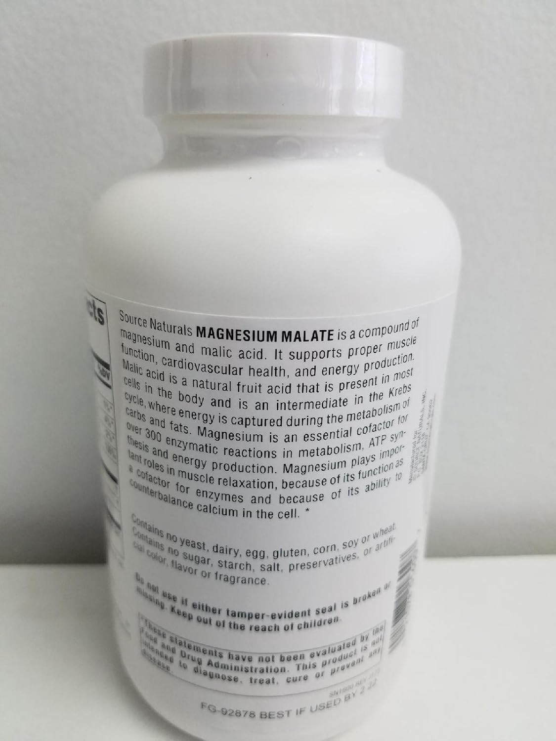Dietary supplement. Yielding 416.5 mg malic acid. Source Naturals Magnesium Malate is a compound of magnesium and malic acid. Malic acid is a natural fruit acid that is present in most cells in the body and is an important component of numerous enzymes key to ATP synthesis and energy, production. Magnesium is an essential mineral in over 300 enzymatic reactions in metabolism. These reactions include those involved in the Krebs cycle (one of the body’s main energy production processes), energy storage, the breakdown of fatty acids, protein synthesis, DNA metabolism, neurotransmitter activity and hormone regulation. (These statements have not been evaluated by the Food and Drug Administration. This product is not intended to diagnose, treat, cure, or prevent any disease.) Hypoallergenic: Contains no yeast, dairy, egg, gluten, corn, soy or wheat. Contains no sugar, starch, salt, preservatives, or artificial color, flavor or fragrance.