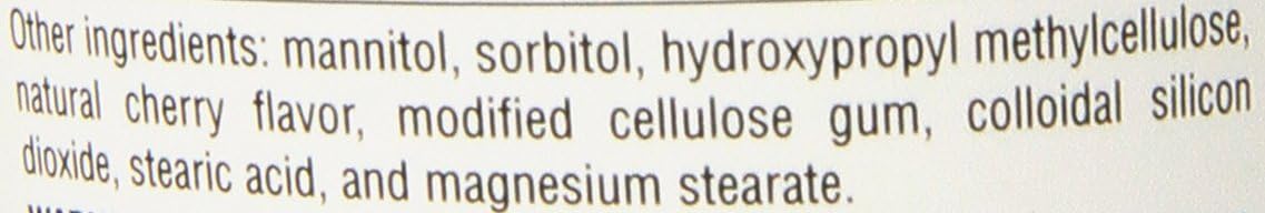 Other ingredients include mannitol, sorbitol, hydroxypropyl methylcellulose, natural cherry flavor, modified cellulose gum, silica, stearic acid, and magnesium stearate.