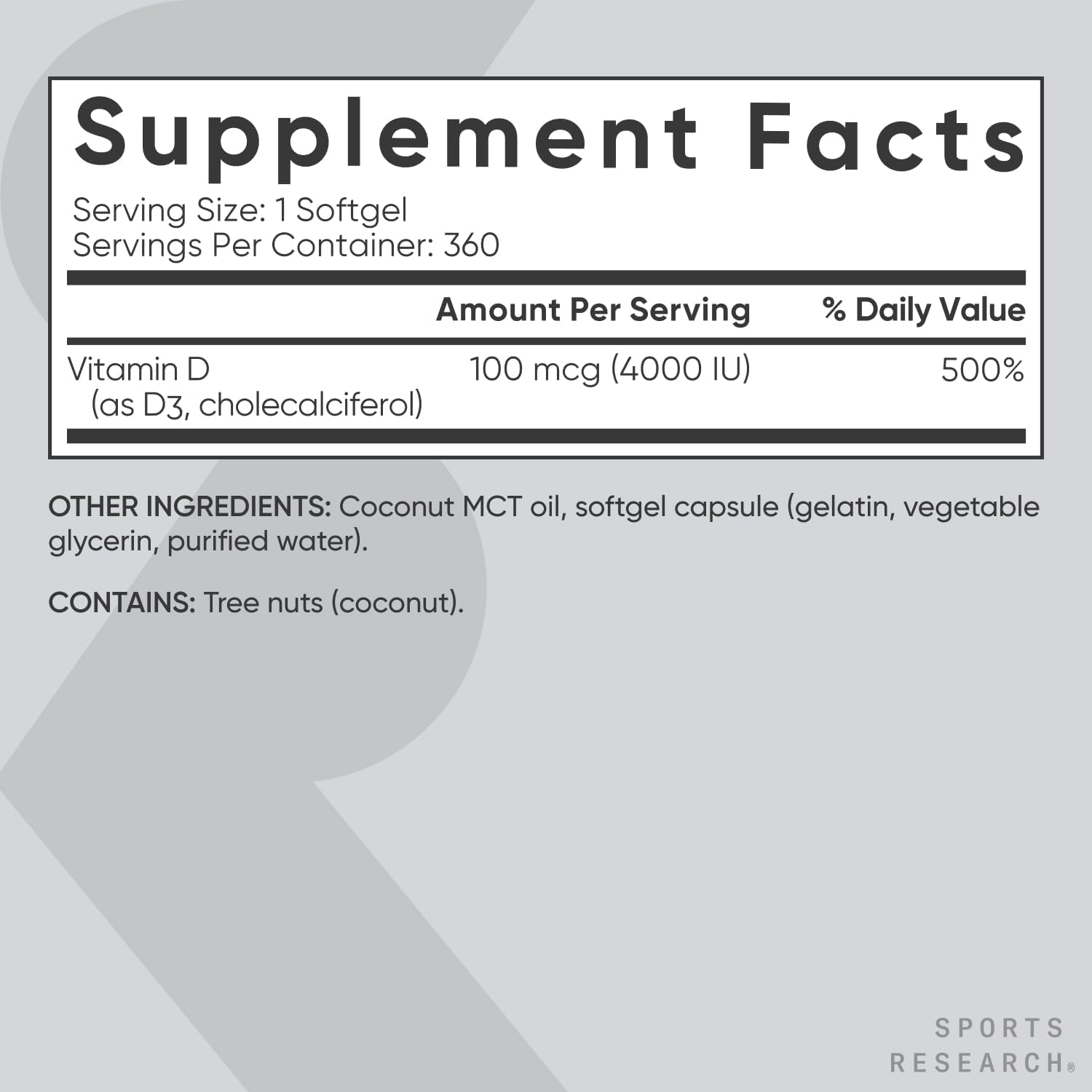 Sports Research Vitamin D3 4000 IU with Coconut MCT Oil – Double Strength Vitamin D Supplement – Non-GMO Verified, Gluten & Soy Free – 100mcg, 360 Liquid Softgels