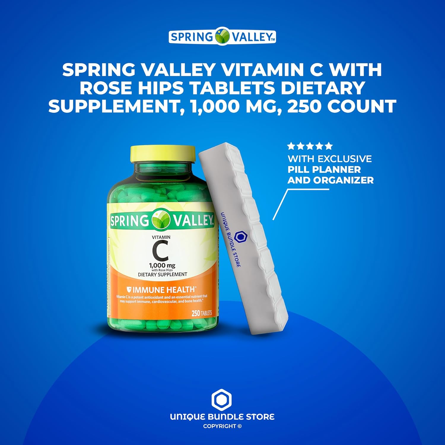 Spring Valley, Vitamin C with Rose HIPS 1000MG, Tablets Dietary Supplement, Vitamin C 1000MG, 250 Count + 7 Day Pill Organizer Included (Pack of 1)