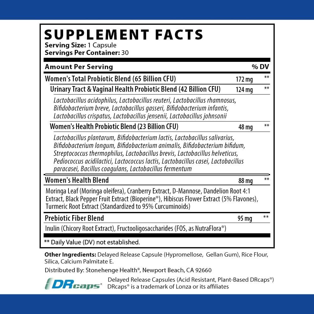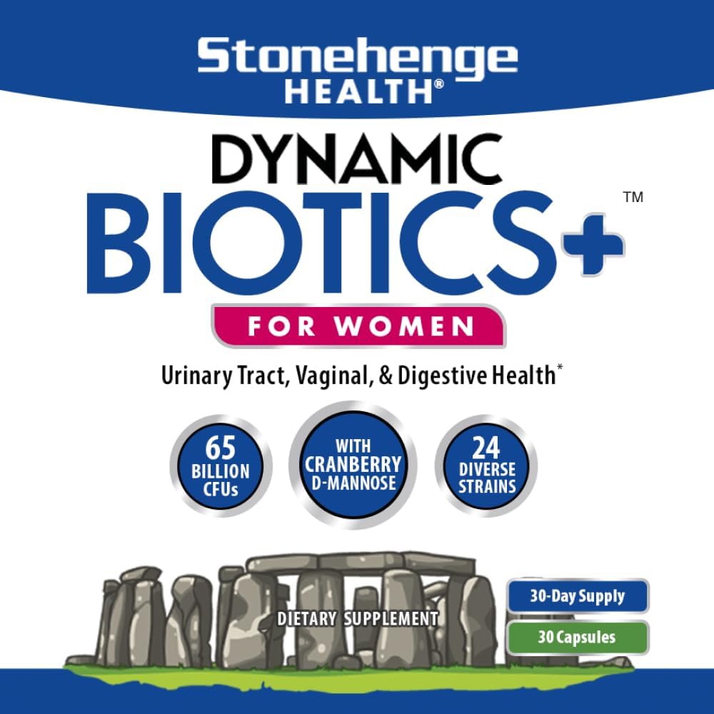Stonehenge Health Probiotics 65 Billion CFU + 24 Strains, Prebiotic, Synbiotics Dynamic Biotics+ for Women, Cranberry, Urinary Tract & Vaginal Health Blend, Delayed Release, Shelf Stable, Non-GMO