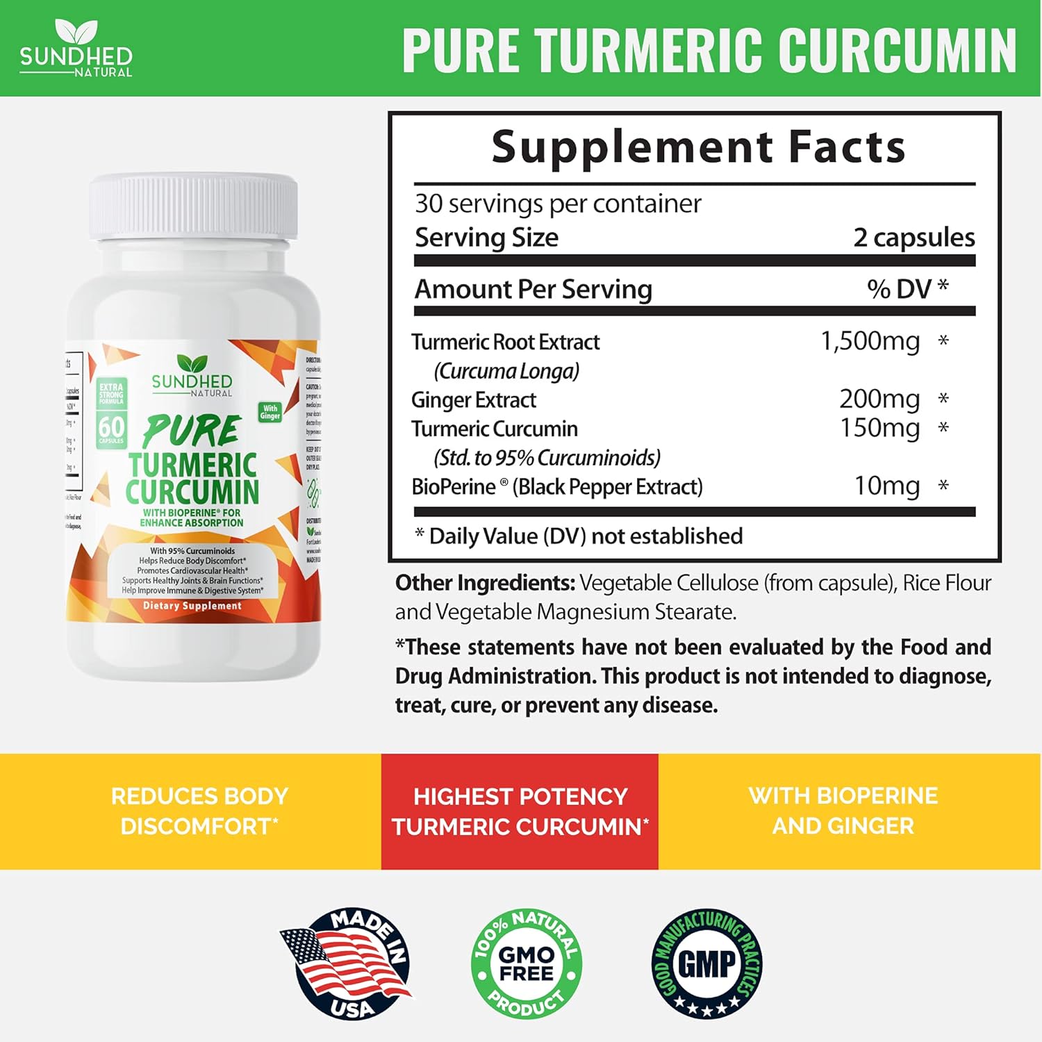 Sundhed Natural Pure Turmeric Curcumin Capsules (60 Caps) – All Natural Turmeric Supplement with 95% Standardized Curcuminoids – Powerful Turmeric Pills, Total Joint Support Tumeric Supplements