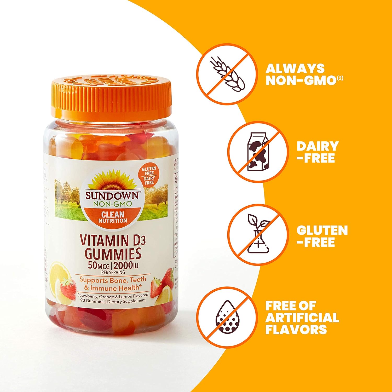 Sundown Vitamin D3 50mcg 2000IU Gummies for Immune Support, Non-GMO, Dairy-Free, Gluten-Free, Naturally Flavored, 90 Count
