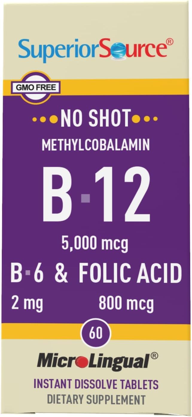 Superior Source No Shot Vitamin B12 Methylcobalamin (5000 mcg), B6, Folic Acid, Quick Dissolve Sublingual Tablets, 60 Ct, Increase Energy, Healthy Heart, Boost Metabolism, Stress Support, Non-GMO