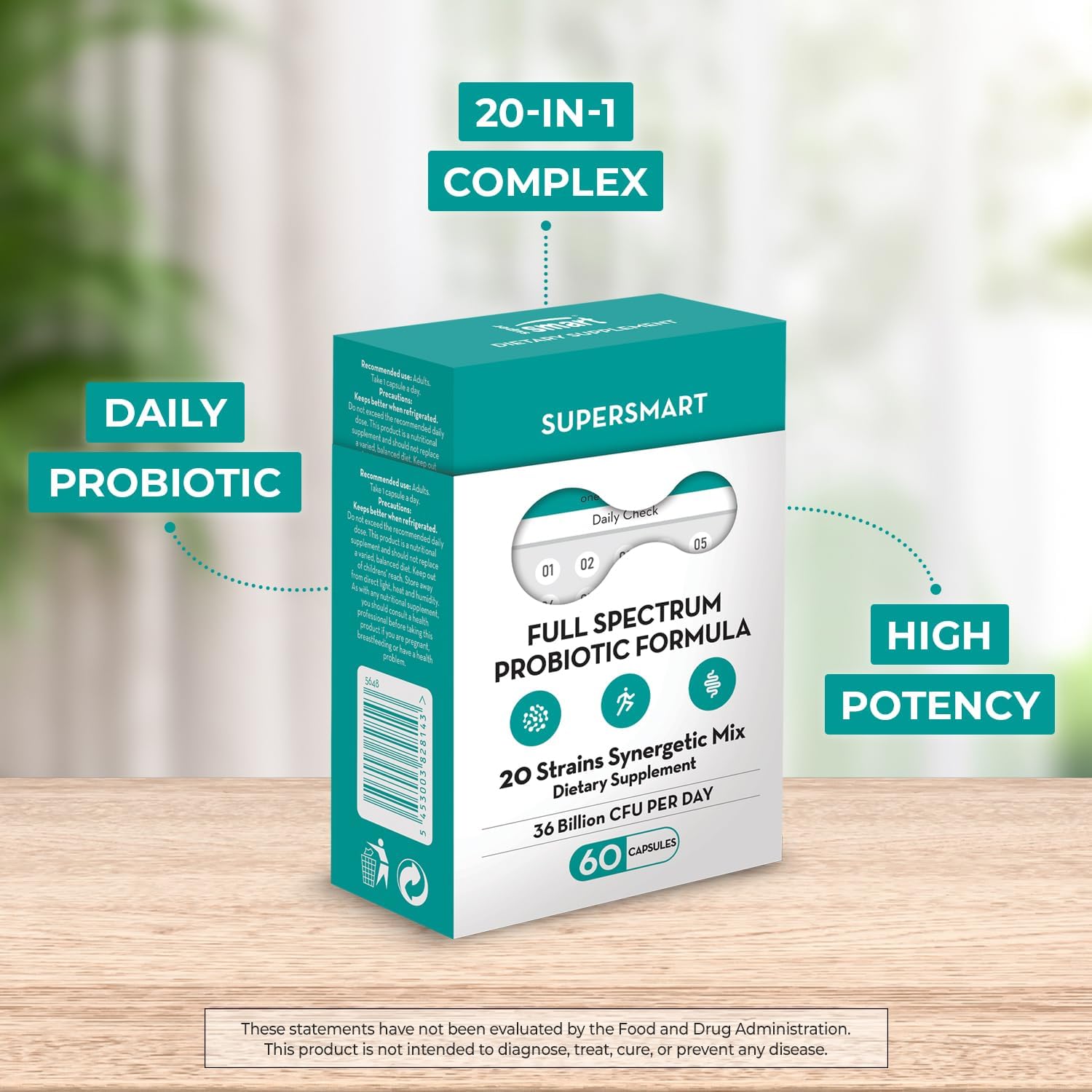 Supersmart – Full Spectrum Probiotic Formula 36 Billion CFU per Day (20-in-1 Complex) – with Lactobacillus Reuteri, Gasseri, Rhamnosus, Crispatus | Non-GMO & Gluten Free – 60 Vegetarian Capsules