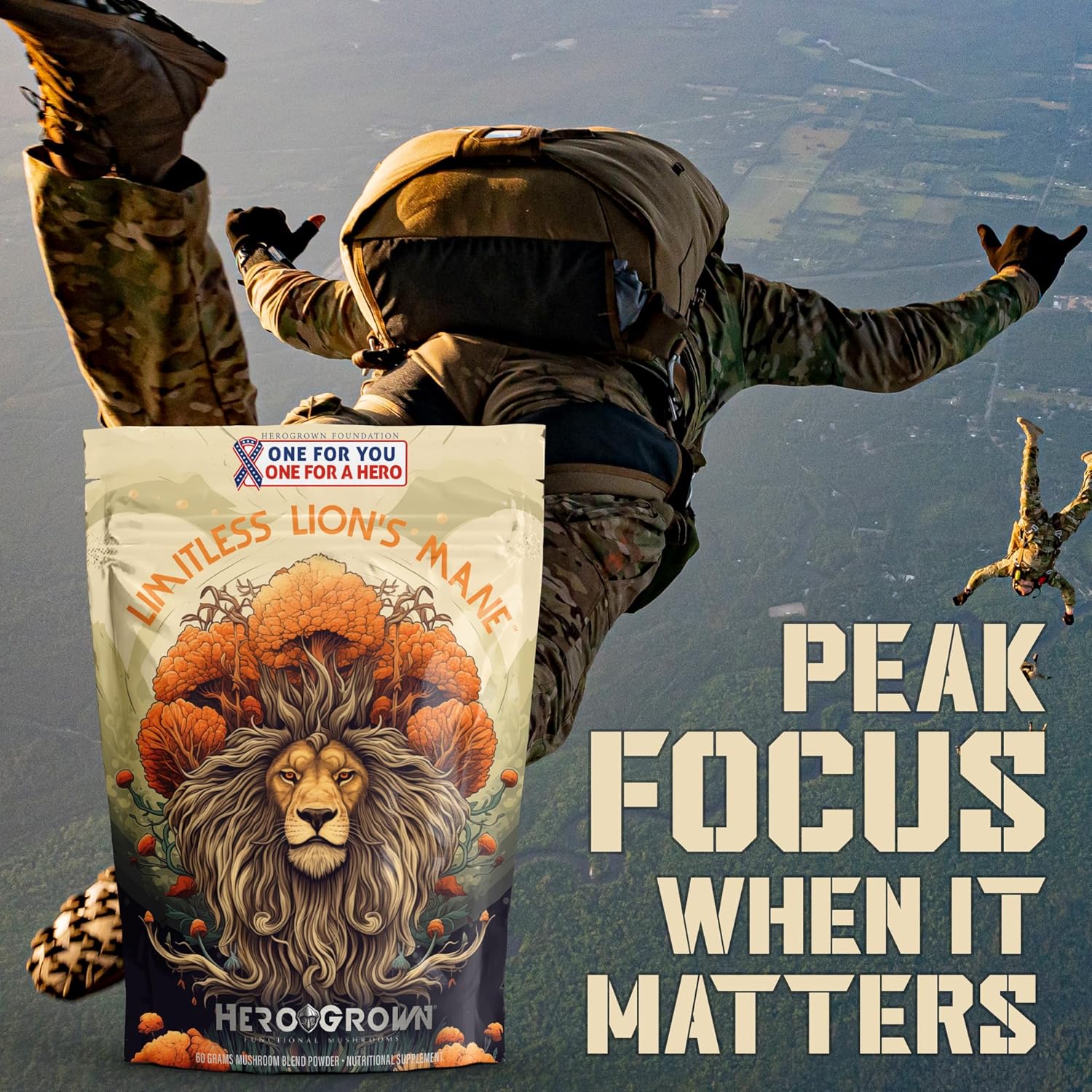 ONE FOR YOU, ONE FOR A HERO: Make a difference with every bag. For every bag of HeroGrown Functional Mushrooms sold, we send one to an active duty service member or disabled veteran.