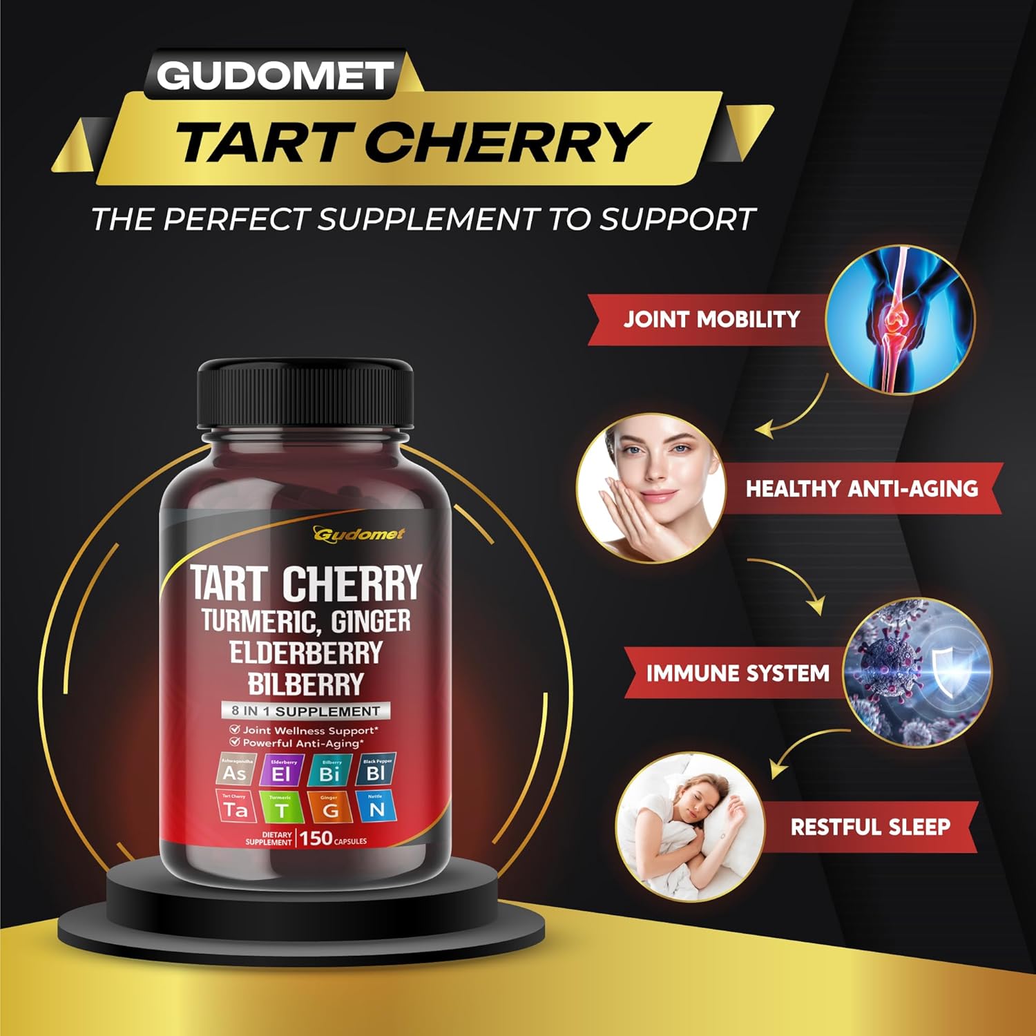 Tart Cherry Turmeric Ginger Stinging Ashwagandha Elderberry Bilberry Black Pepper -150 Capsules- Made in USA