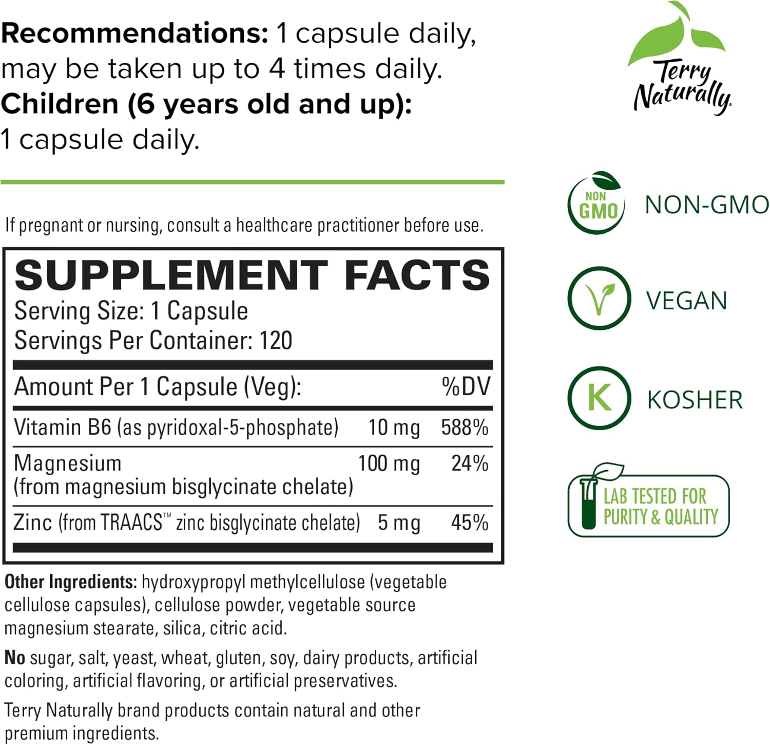 Terry Naturally BioActive Magnesium Complex – 120 Capsules – with Vitamin B6 & Zinc – Non-GMO, Vegan, Gluten Free, Kosher – 120 Servings