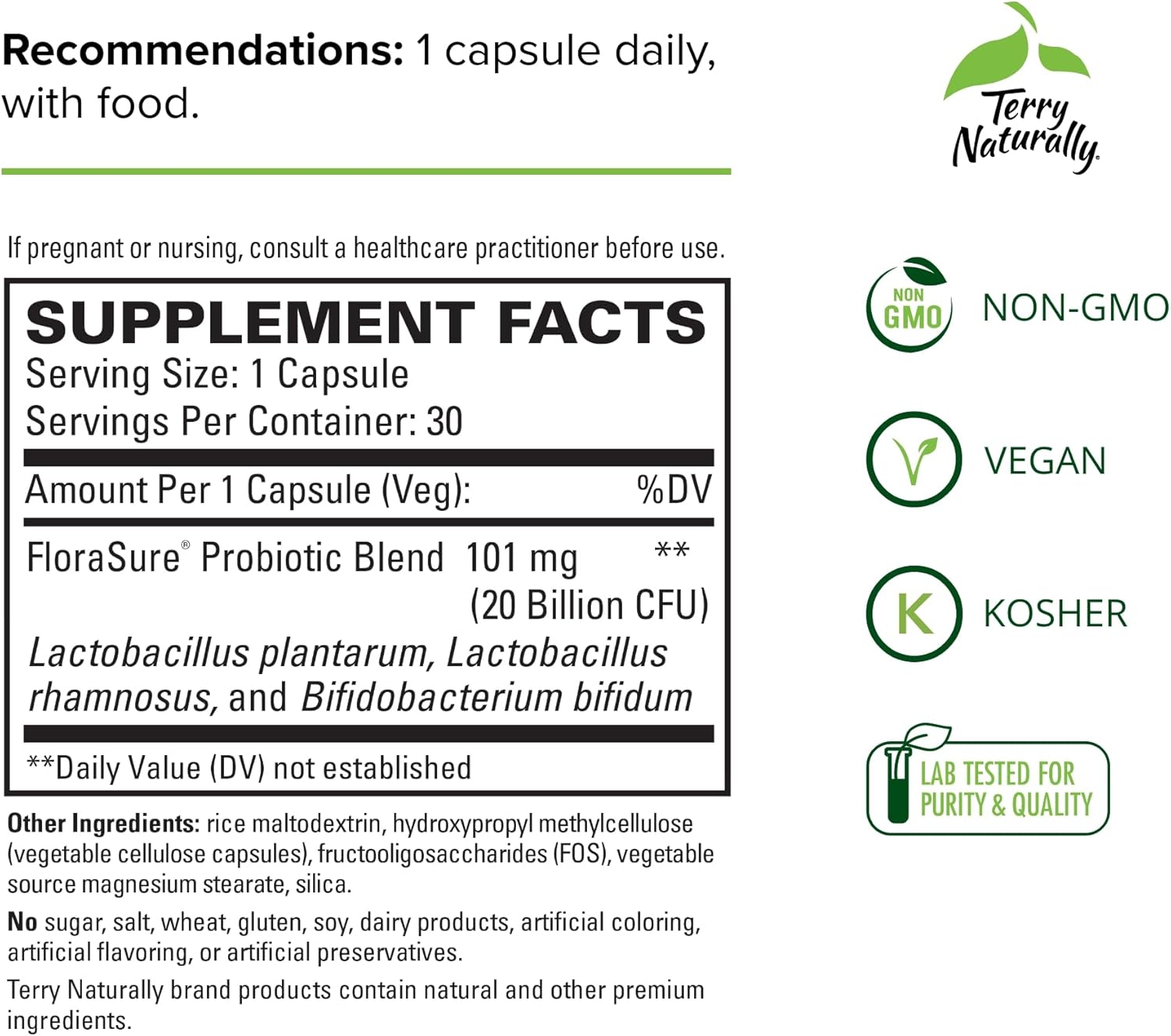 Terry Naturally FloraSure Probiotic – 30 Capsules, Pack of 2 – Daily Support for Healthy Digestion – Non-GMO, Vegan, Kosher – 60 Total Servings