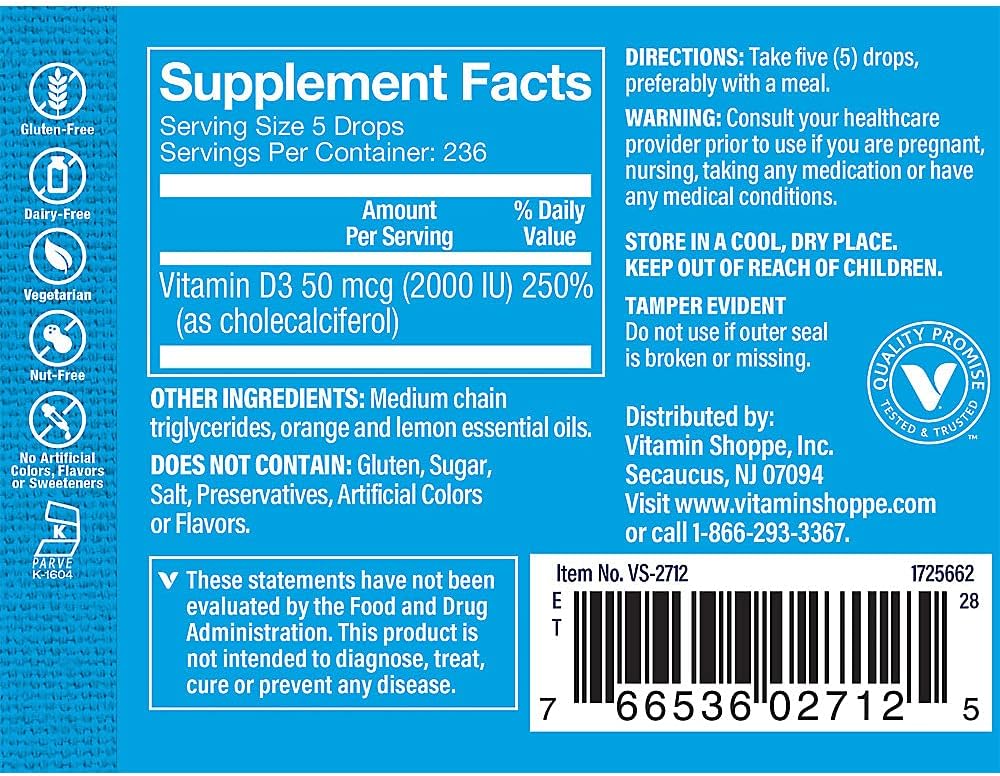 Liquid Vitamin D-3: A concentrated serving of one of the most important vitamins, just 5 drops of the Vitamin Shoppe Liquid Vitamin D-3 provides 2,000 IU to help you maintain strong, healthy bones.