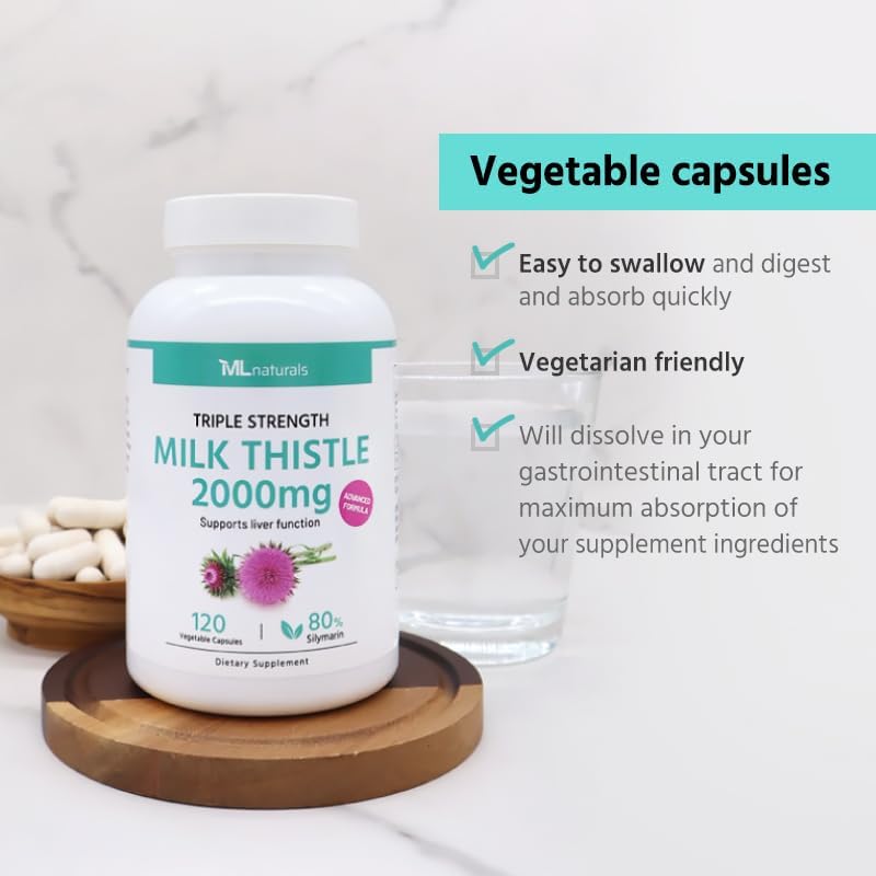 ML Naturals Triple Strength Milk Thistle 2000 mg (High Dosage & Potency Silymarin 400 mg per serving), 120 Vegetable Capsules (4 months supply) One a Day Premium Quality, Supports Liver health.