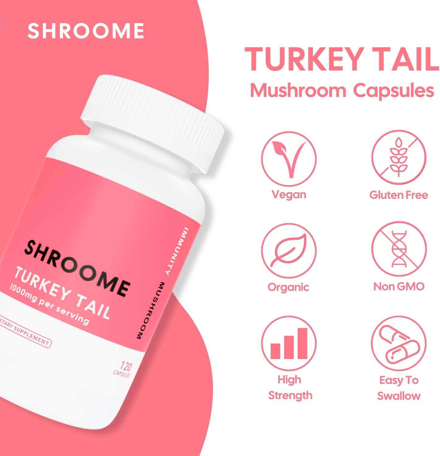 Vegan, Gluten-Free and Addative Free: SHROOME prioritises quality first. Perfect for vegans and gluten-free diets. Enjoy our Turkey Tail Mushroom capsules with total confidence.