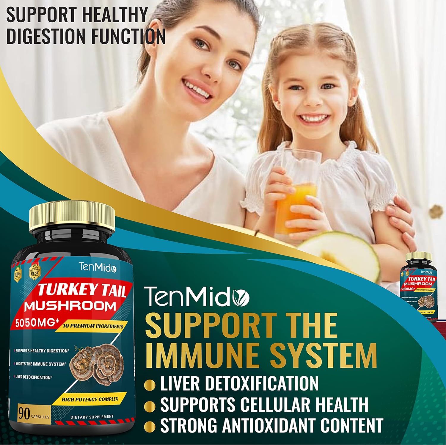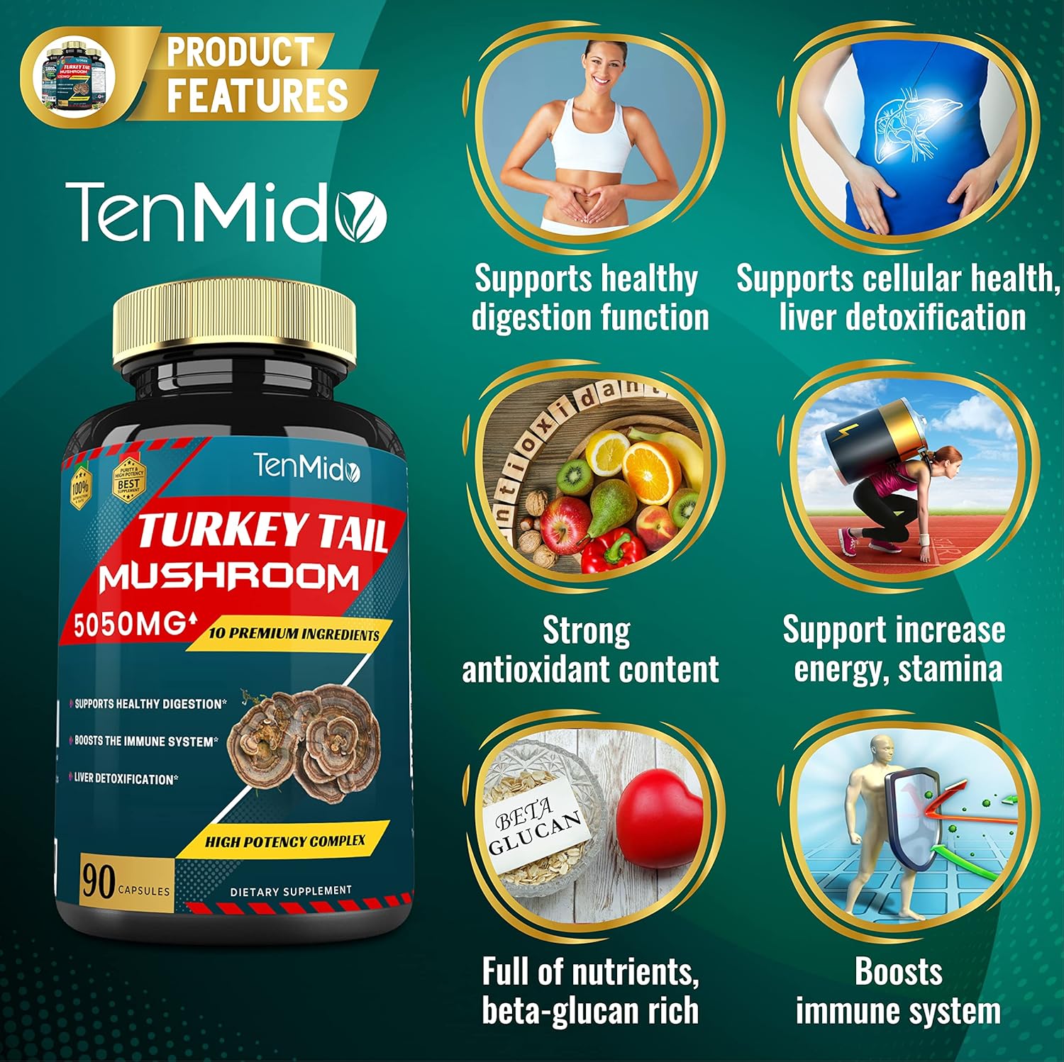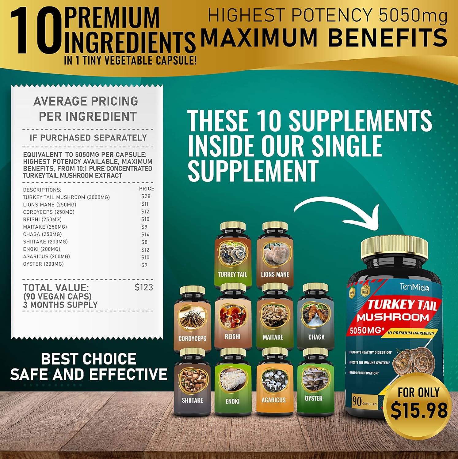Turkey Tail Mushroom Extract 5050mg with Lions Mane, Cordyceps, Reishi and More, 10 Herbs in 1 | Improves Digestive Function, Supports Immune System, 3 Months Supply