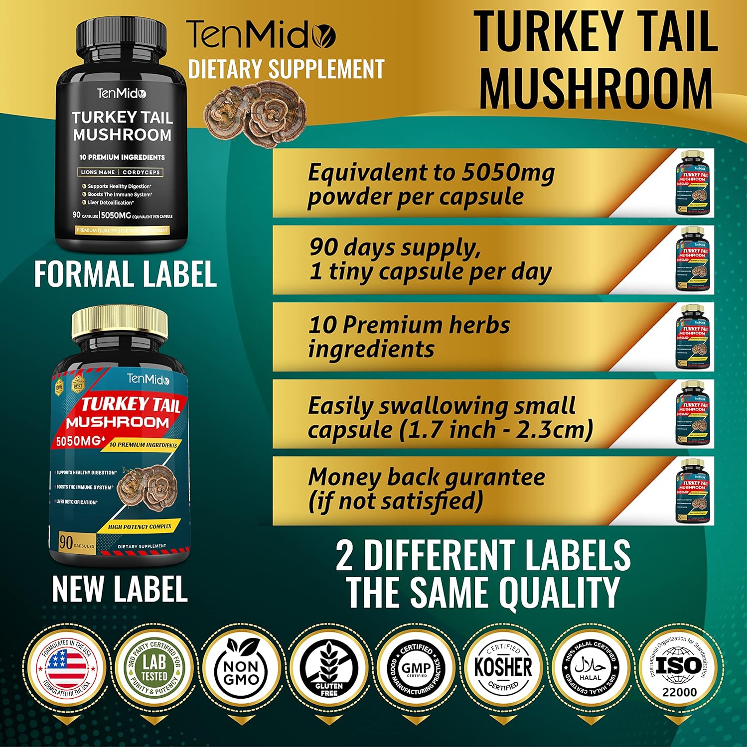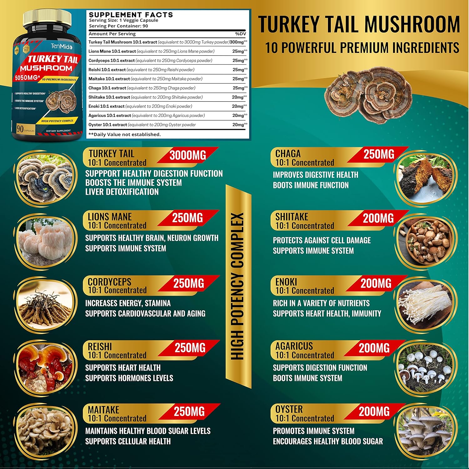 ❤️ High Potency Complex: Turkey Tail Mushroom extract capsules combination equivalent to 5050mg powder of the highest quality Turkey Tail Mushroom powder with 9 extra powerful herbs problematic ingredients: Lions Mane, Organic Cordyceps, Reishi, Maitake, Chaga, Shiitake, Enoki, Agaricus, Oyster Mushroom. With the special optimized formula, our product has been shown to be one of the most advantageous herbs, highest absorption and bioavailability for your overall health.