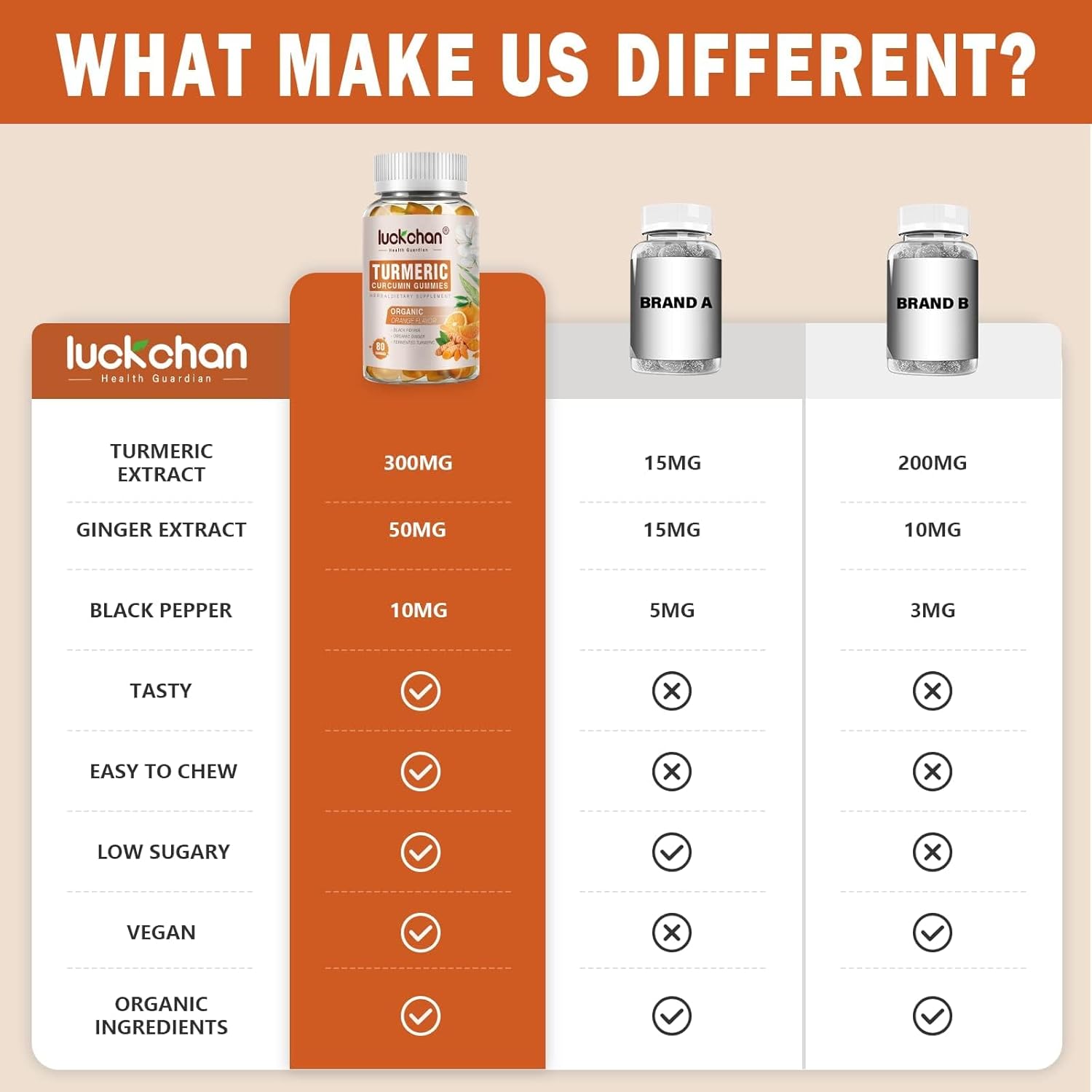 ANTI-INFLAMMATORY SUPPLEMENTS – Curcumin is a natural anti-inflammatory compound with a strong anti-inflammatory effect. LUCKCHAN turmeric chews gummies is rich in curcumin. You can obtain curcumin by chewing gummy to reduce inflammation, help relieve joints discomfort, and improve your health