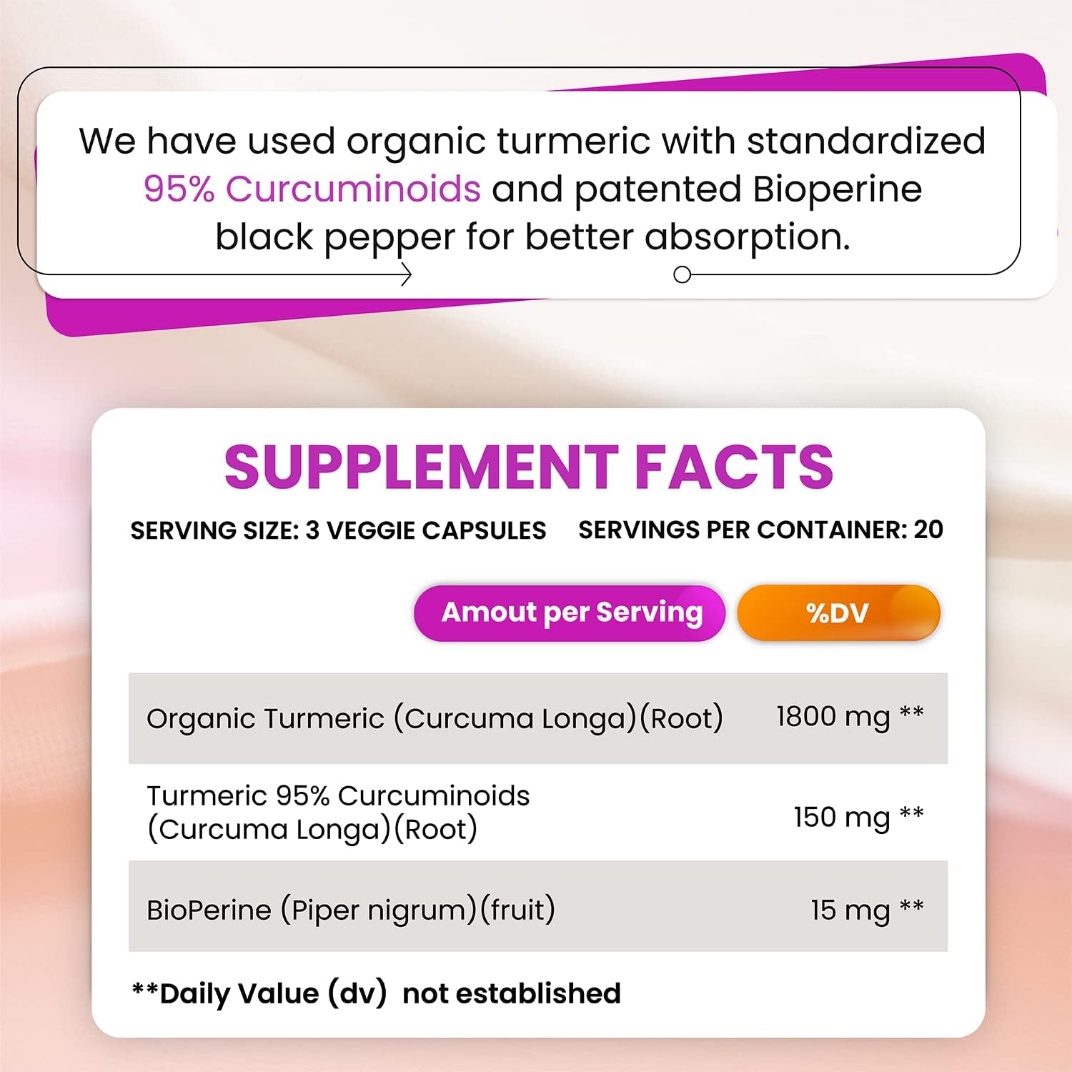 High-Potency Formula: Our Turmeric Curcumin supplement contains a potent blend of organic turmeric and curcuminoids for maximum strength and efficacy.