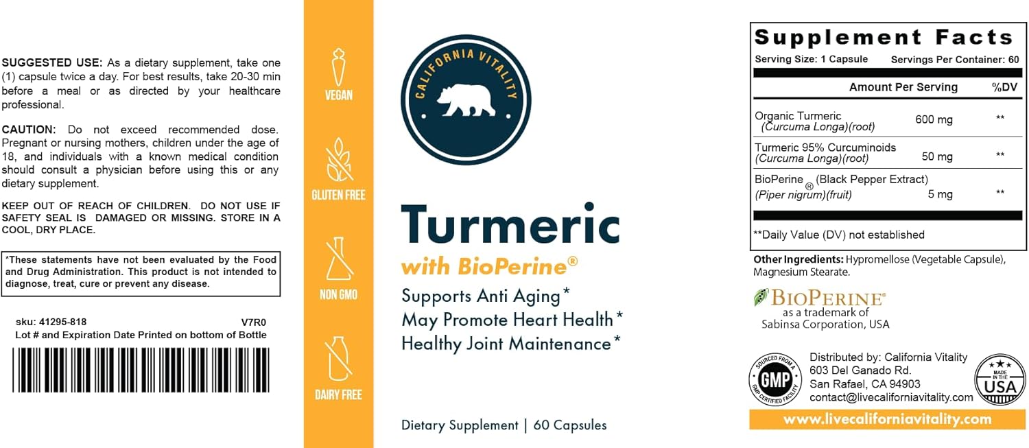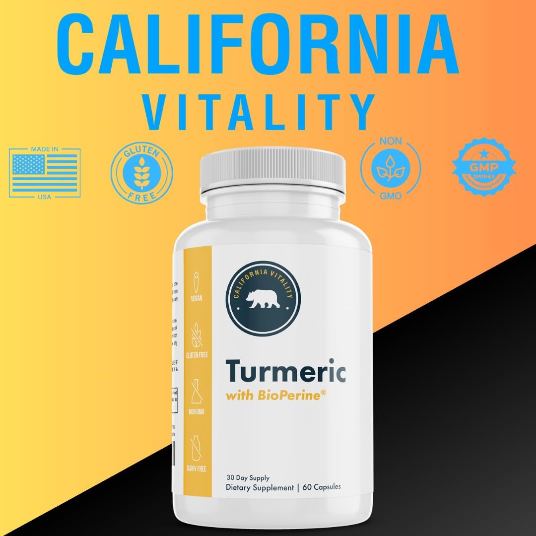 Experience the power of California Vitality’s Turmeric with BioPerine formula is loaded with 600mg of turmeric and standardized to 95% curcuminoids.