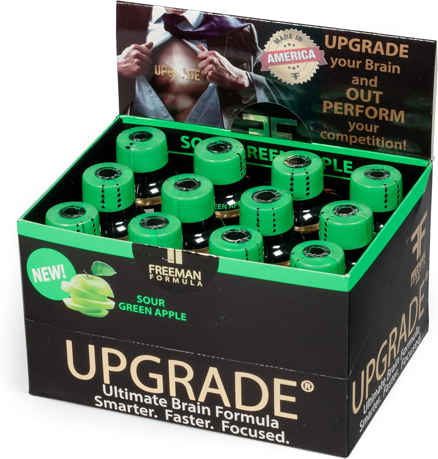 In the 12 pack of Upgrade Brain Supplement 1.8Fl oz Bottles you get the energy boosting green apple flavored super drink. Upgrade is a brain formula that creates long-lasting, non-jitter, no-adrenal stimulant energy, incredible mental clarity, and sustained focus. Every bottle of Upgrade was formulated to work with your body rather than against it. Other energy products down-regulate the adrenal function, creating adrenal fatigue which results in low energy, weight gain, exhaustion, dulled senses, and sluggishness. Upgrade helps you be the best you. In the bottle you will find mental clarity, boosted memory & concentration, and the energy to get it done. Regardless of if you are a businessman, teacher, gamer, athlete, engineer, or etc. Freeman Formula Upgrade will upgrade your system!