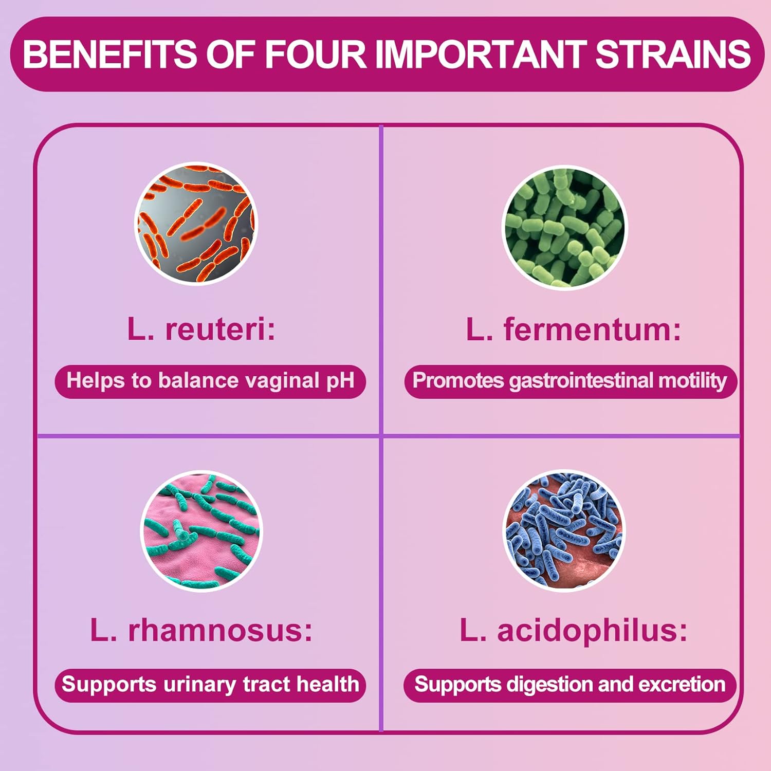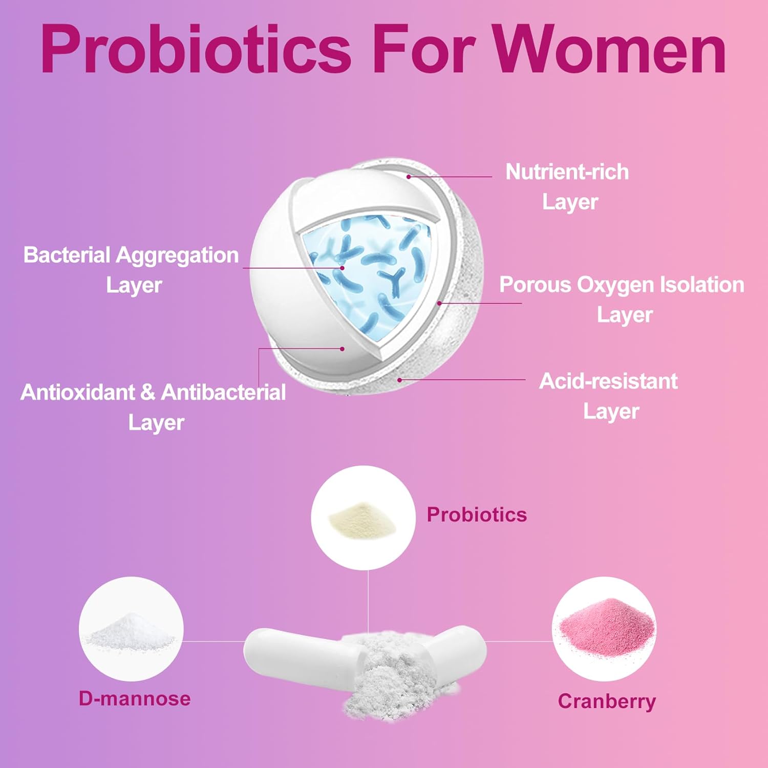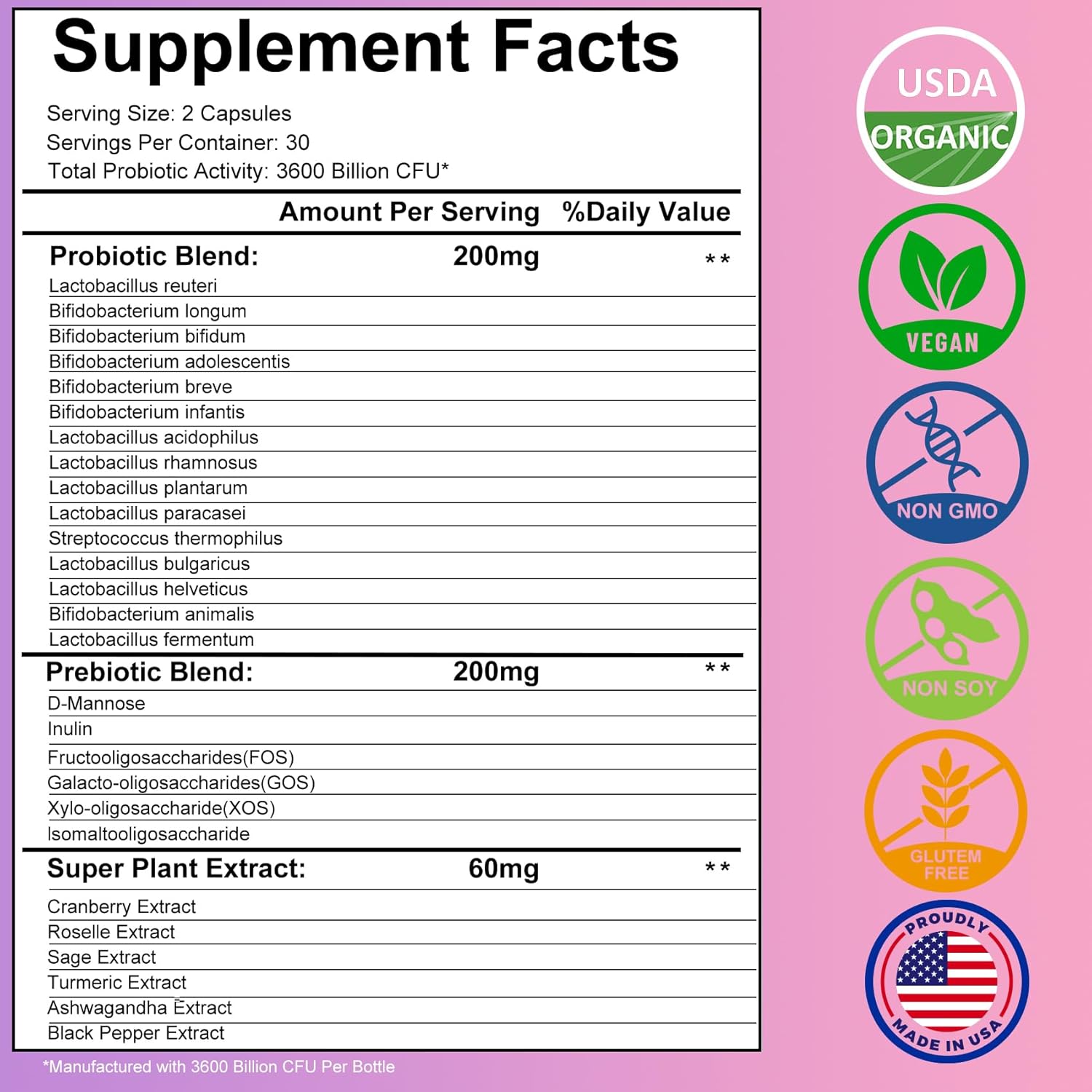 👸🏻SUPPORT WOMEN’S HEALTH: Keep vaginal pH balance Our probiotics for women made in the USA does more than just support your digestive system, women’s probiotics vegan-friendly capsules include D-mannose and cranberry for urinary tract, vaginal and immune system support, help relieve PMS carmps; L. reuteri & L. fermentum for optimal vaginal pH balance, reduce vaginal odor, itching, L. rhamnosus for urinary tract health, L. acidophilus for digestion and excretion, and B. breve for long-lasting health & fitness results.