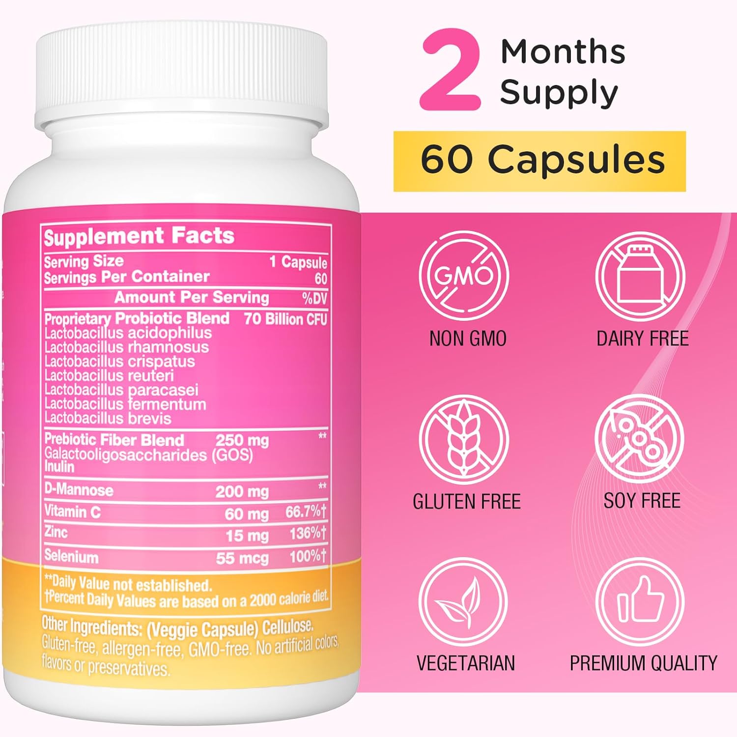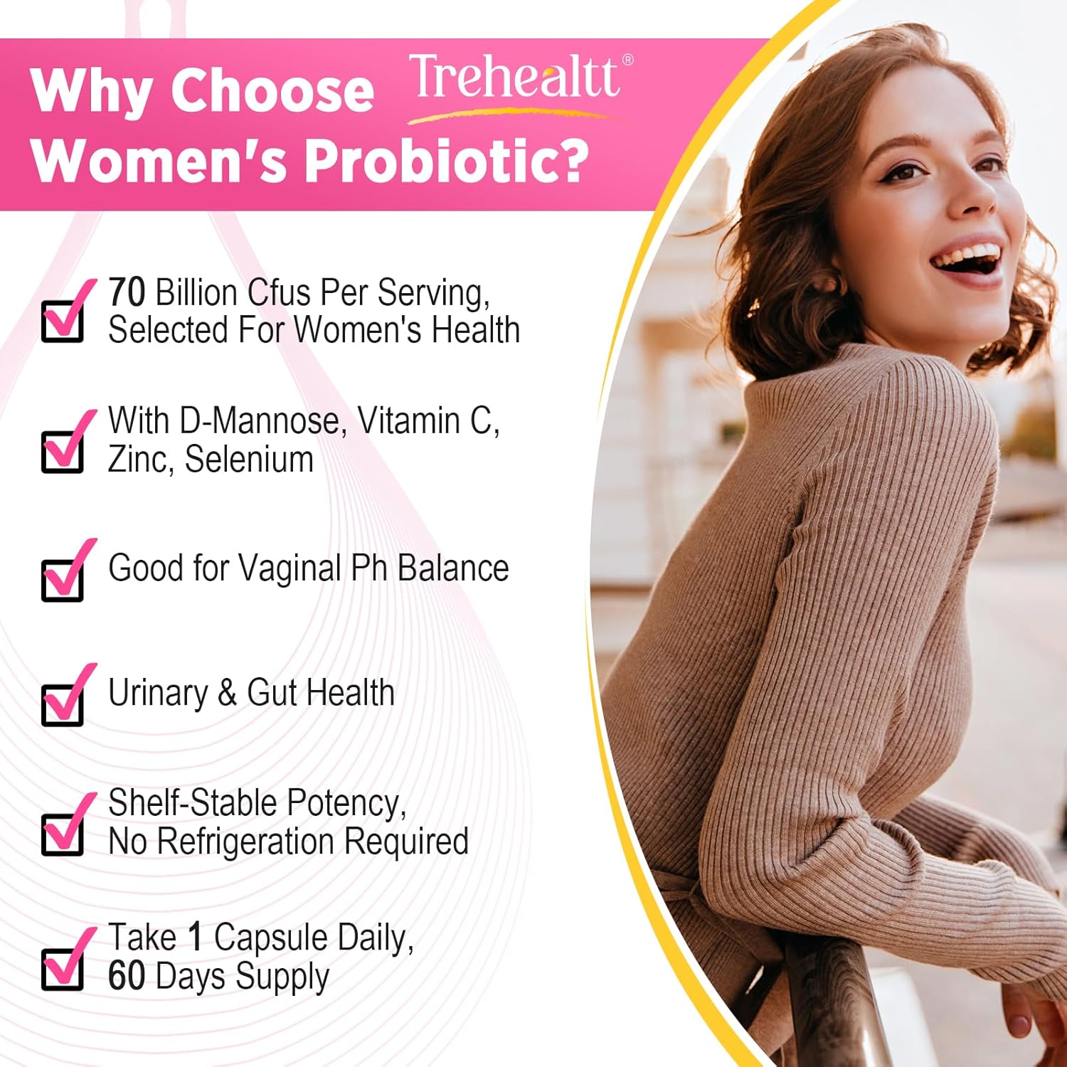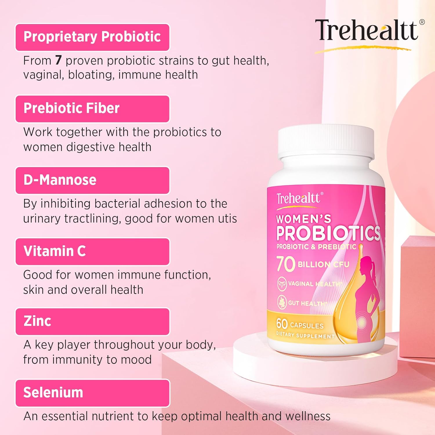 💗TAILORED FOR WOMEN PROBIOTIC – Formulated with 13-in-1 powerful ingredients. Trehealtt 70 Billion CFUs Vaginal Probiotics feature a unique blend of high-quality organic ingredients, including 7 Lactobacillus Probiotics + 2 Prebiotics, D-Mannose, Vitamin C, Zinc, and Selenium, good to women’s health benefits and wellness. Our probiotic is designed specifically for feminine health & overall digestive health.