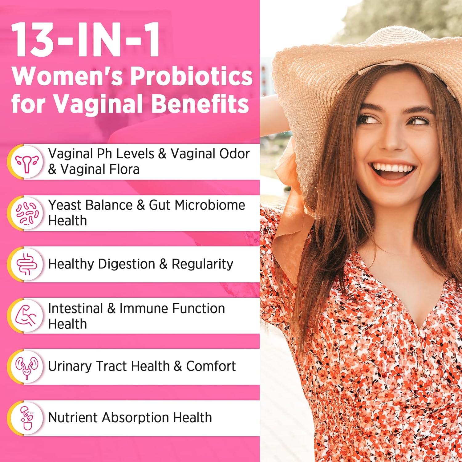 Vaginal Probiotics for Women, 13-IN-1 Women’s Probiotic, 70 Billion CFU Probiotics & Prebiotics & D-Mannose, for Vaginal, Urinary Tract, PH Balance, Immune, Digestive, Bloating Health, 2 Months Supply