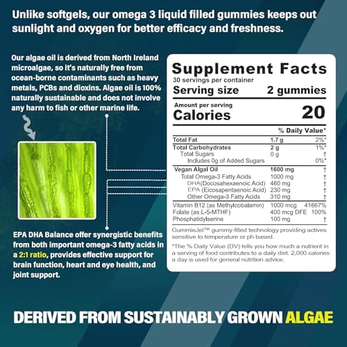 Vegan Omega 3 Gummies 1000mg, Sugar Free Omega 3 Fish Oil Supplements Alternative, from Marine Algae Oil Plus DHA 460mg & EPA 230mg, Vitamin B12, Folate for Brain, Bone, Joint, Eye & Immunity, 60 Cts