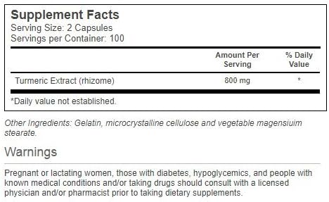 What is turmeric?Turmeric (Curcuma longa) is an ancient spice native to India and Southeast Asia, best known for its distinctive flavor and yellow color, used in curries and some prepared mustards. Curcumin, the active ingredient in turmeric, contains a mixture of powerful phytonutrients known as curcuminoids. How does turmeric support health?Helps maintain a healthy inflammatory response.*Provides powerful free radical scavenging activity.*Helps maintain the health of brain cells.*Promotes healthy liver function.*Supports the health of the liver even under challenging circumstances.*Why choose Vitacost Turmeric?Supplies 800 mg of turmeric extract per 2-capsule serving.Turmeric is non-irradiated, meaning it hasnt been exposed to radiation in order to preserve shelf life.Contains 100 servings per bottle.Incredible value!About VitacostAll Vitacost products are laboratory tested to meet FDA standards for identity, purity and composition. All products are tested for heavy metals, microbiology and contaminants. Vitacost products are produced in a NSF Certified facility. Freshness is guaranteed. * These statements have not been evaluated by the Food and Drug Administration. This product is not intended to diagnose, treat, cure or prevent any disease.