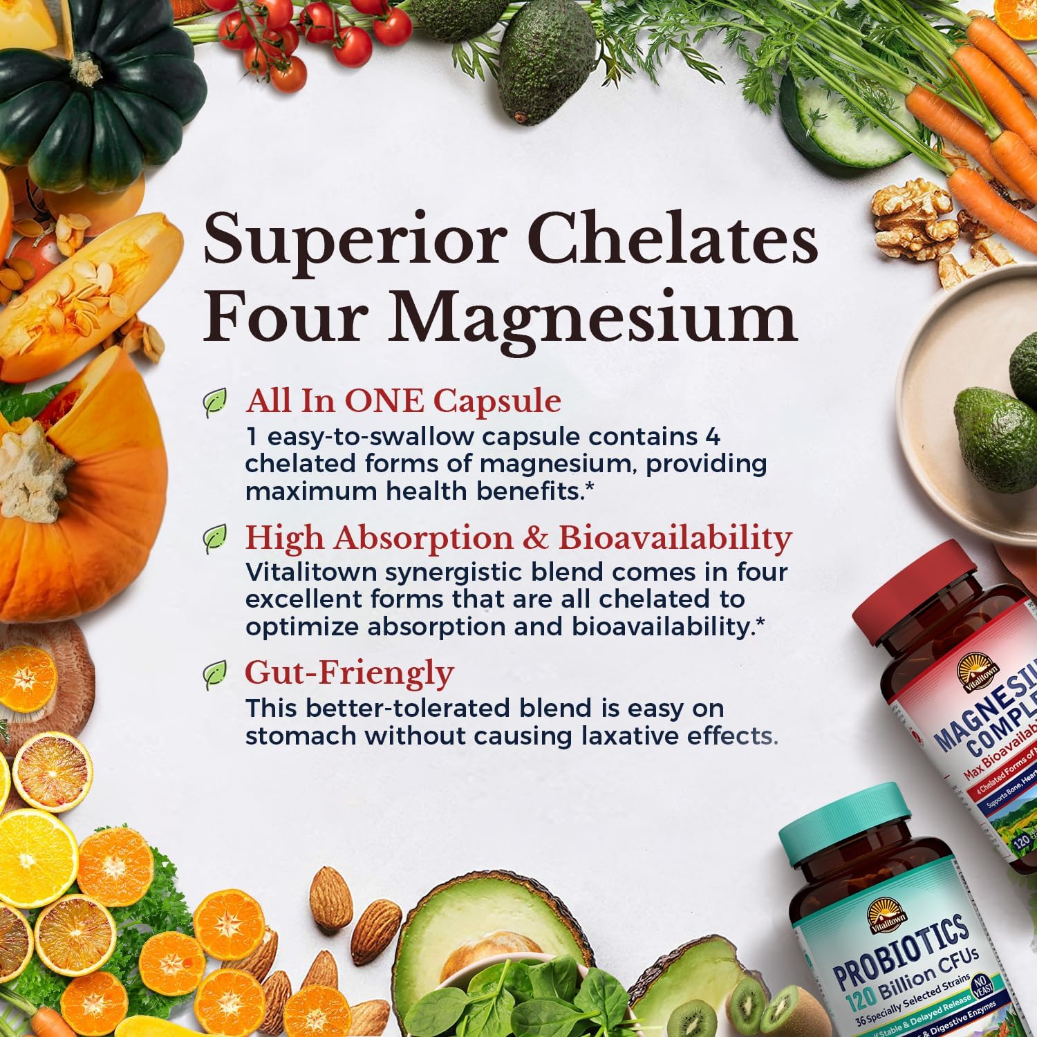 Vitalitown Magnesium + Probiotic Bundle (Pack of 2) | Magnesium Complex (Item 1) & Probiotics 120 Billion CFUs (Item 2) | 120 Magnesium Capsules & 30 Probiotic Capsules