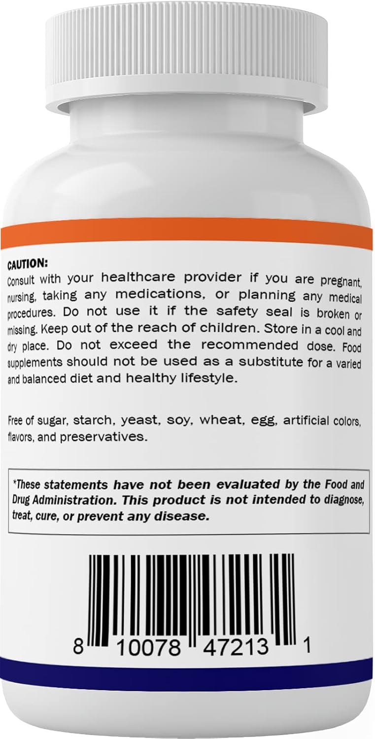 Free of Sugar, Starch, Sodium, Soy, Yeast, Corn, Wheat, Egg, Artificial Color, Flavor & Preservatives.