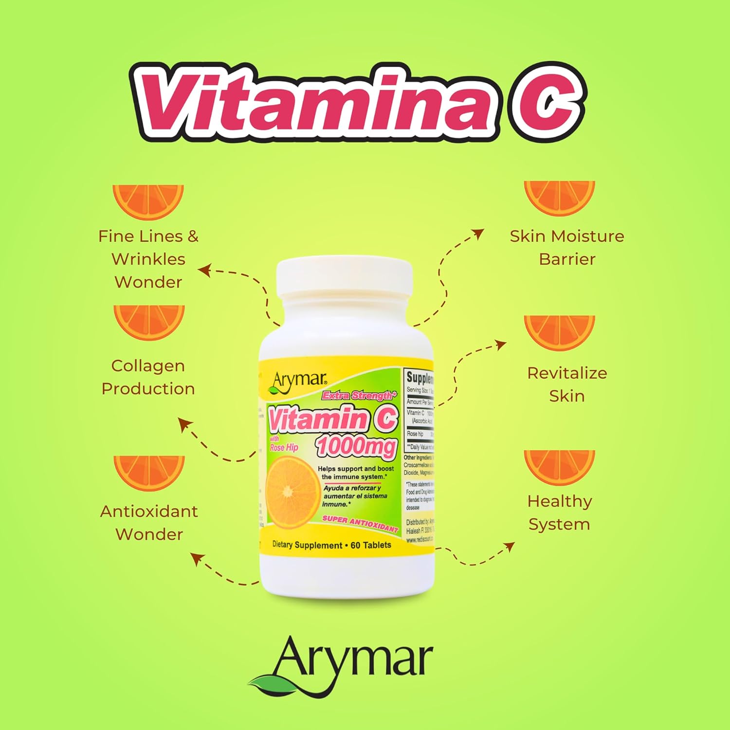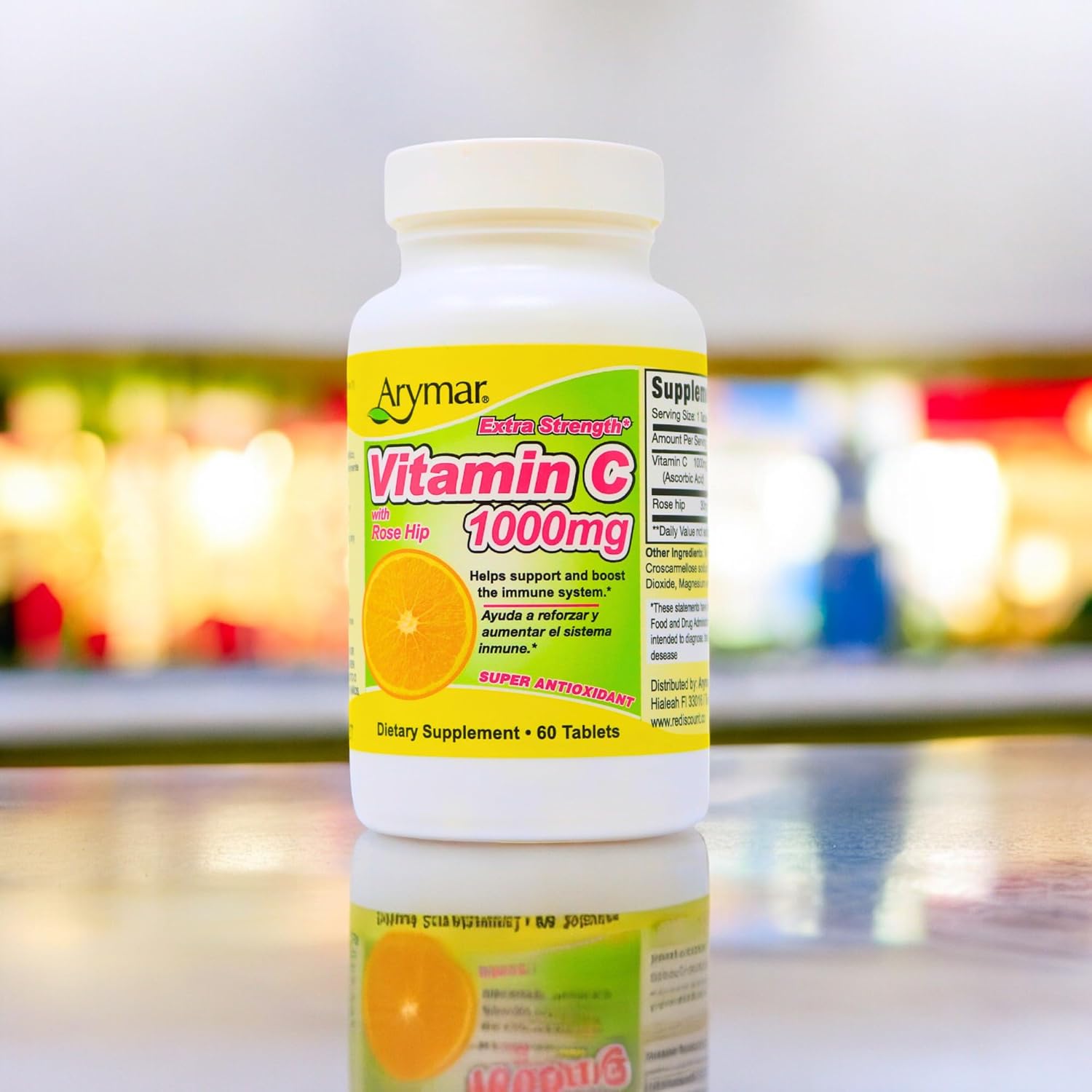 Arymar Vitamin C 1000 mg with Rosehip Extract 30 mg offers a convenient and high-potency source of Vitamin C for daily supplementation. Each tablet provides 1000 mg of Vitamin C with 30 mg of rosehip extract, known for its natural antioxidant properties. Formulated as easy-to-swallow tablets, Arymar Vitamin C is ideal for maintaining daily Vitamin C intake. Manufactured in the USA, these tablets are made with carefully sourced ingredients to ensure high purity and potency.