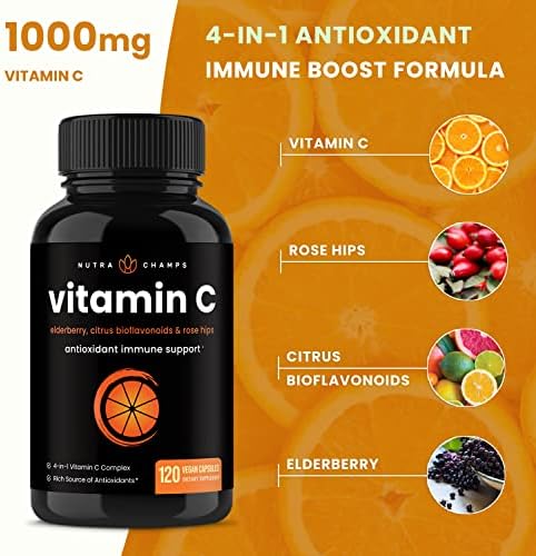 Vitamin C 1000mg with Rose Hips | Vitamin C Supplement with Elderberry & Citrus Bioflavonoids | Kids Immune Boosting Supplement | Non-GMO Antioxidants Supplement | 500mg Vitamin C Capsules Pill