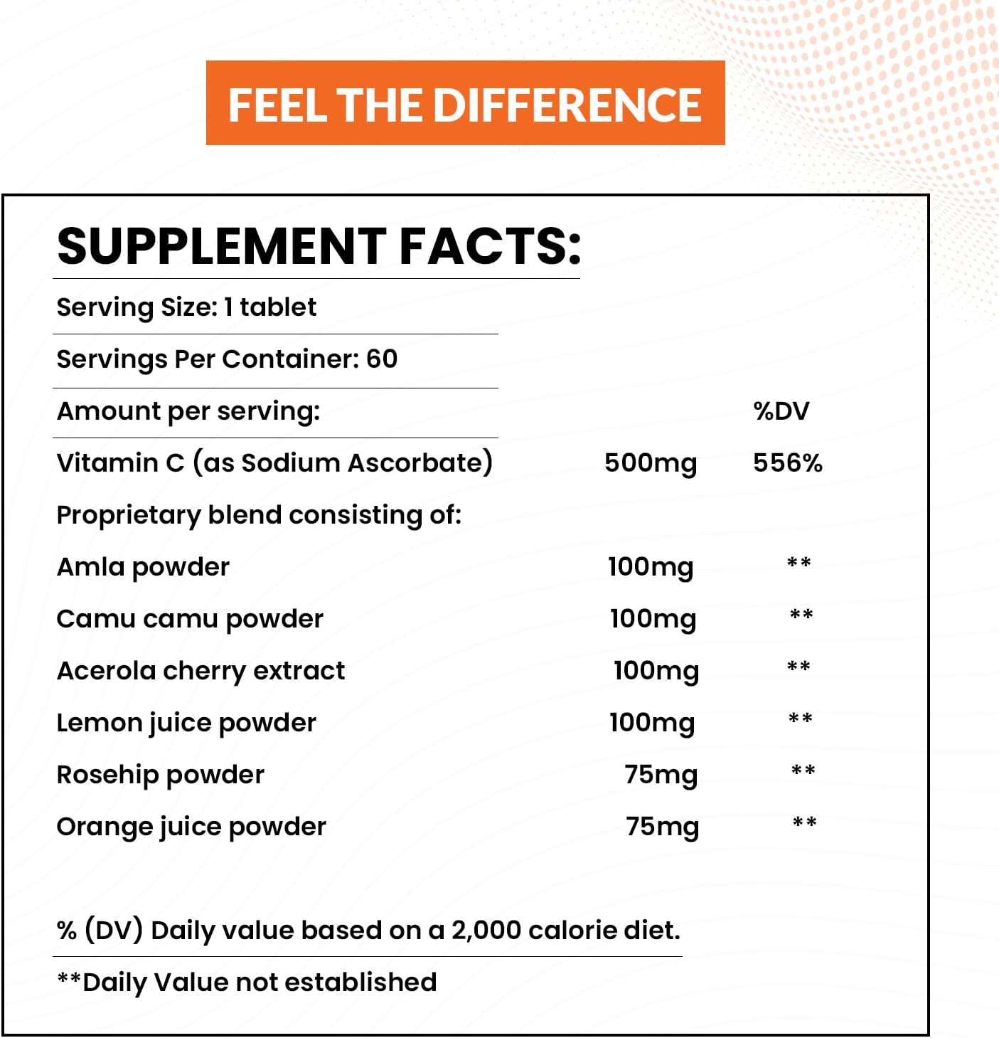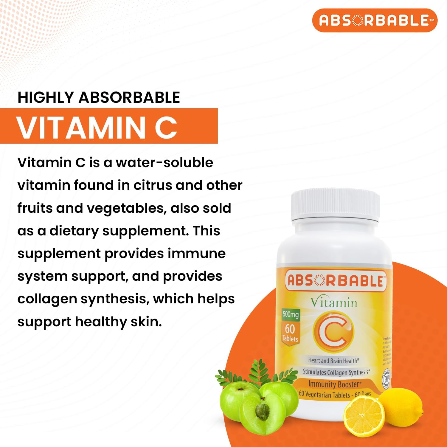 Enhanced Bioavailability: ABSORBABLE Vitamin C comes with a proprietary blend of Amla, Camu Camu, Rosehip, Acerola Cherry, Lemon Juice powder, and Orange Juice Powder. All of these are good sources of Vitamin C and help in enhanced absorption.