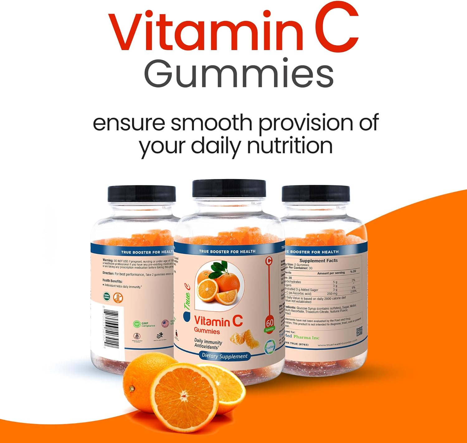 Boost Your Immunity: TrueMed Vitamin C Gummies Made with carbohydrates, sugar, and 250 mg of Vitamin C (as Ascorbic Acid), TrueMed Vitamin C Gummies are completely organic, gluten-free, and non-GMO. It supports your daily immunity and anti-oxidation. Natural Vegetarian Vitamins : TrueMed Vitamin C Gummies are made to efficiently provide immune health. Mixed with original 250 mg of Vitamin C, TrueMed Vitamin C is designed for optimal performance and health. Premium Quality: TrueMed Vitamin C Gummies contain completely natural and all organic ingredients. These dietary supplements contain no added color, preservative, or artificial flavors. Made with 250 mg of TrueMed Vitamin C (as Ascorbic Acid), TrueMed Vitamin C offers: Daily immunity Anti-oxidation smooth provision