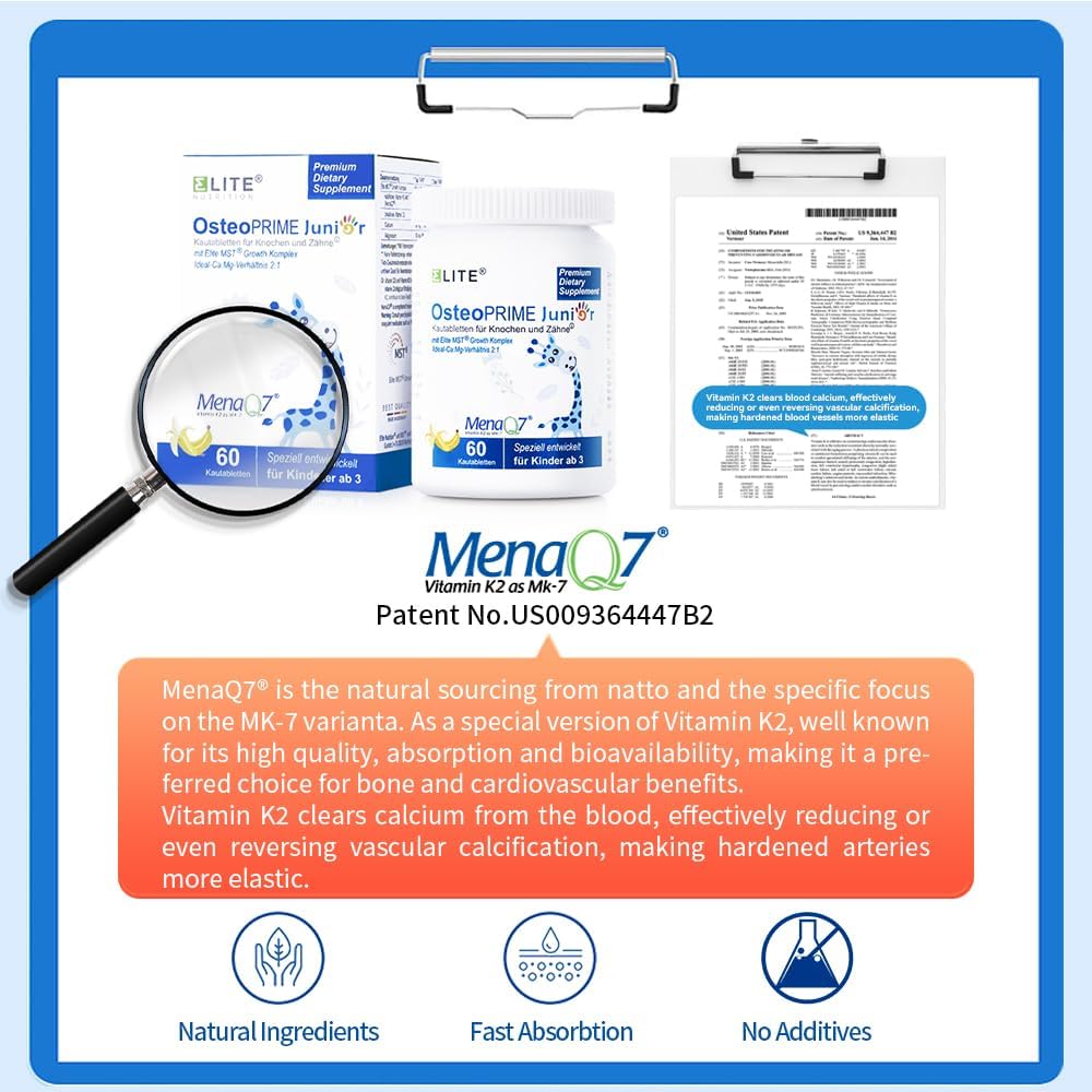 Patent MenaQ7: The natural sourcing from natto and the specific focus on the MK-7 varianta. As a special version of Vitamin K2, well known for its high quality, absorption and bioavailability, making it a preferred choice for bone and cardiovascular benefits.