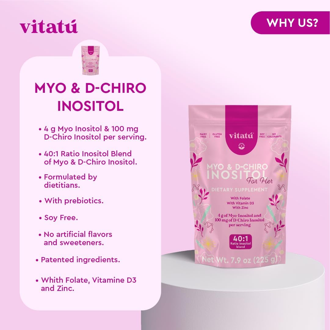 Vitatú | Myo Inositol (4g) & D-Chiro Inositol (1g) Ideal Mix 40:1 | Duration 45 Days | with Folic Acid + Vitamin D3 + Zinc, Powdered Dietary Supplement for Women (225 g)