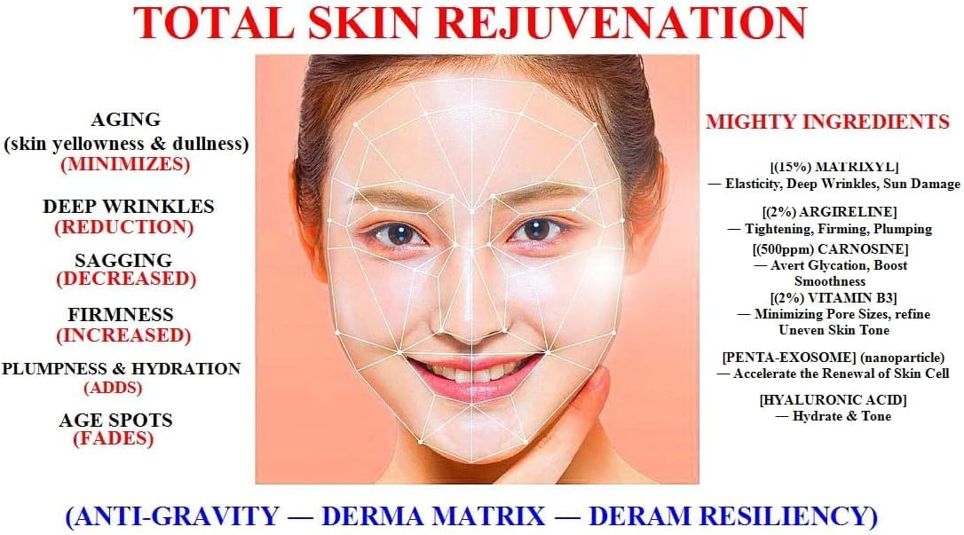 [KEY FEATURES & MIGHTY INGREDIENTS] ✔ [Skin Renew]―SCM ✔ [Anti-gravity effect]―MATRIXYL(skin lifting properties) 📌 Improves the appearance of various types of dynamic wrinkles ✔[Dermal matrix support]― ARGIRELINE(Botox like properties) 📌 derailing future line and wrinkle formation ✔[Supports dermal resiliency]―CARNOSINE & HA 📌 help ward off pro-aging glycation effects (smooth, healthy, and vibrant) ✔[PENTA-Exosome]― Accelerate the Renewal of Skin Cell 📌 optimizes dermal hydration and cellular turnover to reduce the appearance of wrinkles ✔[Lightweight and Absorbs Quickly