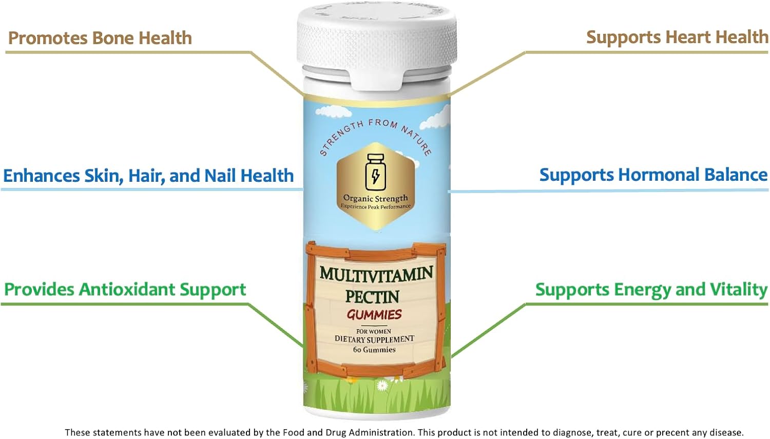 Comprehensive Women’s Health Support: Organic Strength Women’s Multivitamin Pectin Gummies provide comprehensive support for women’s health. Our carefully curated blend of essential vitamins and minerals promotes overall well-being, balances hormone levels, supports energy production, and enhances beauty from within.
