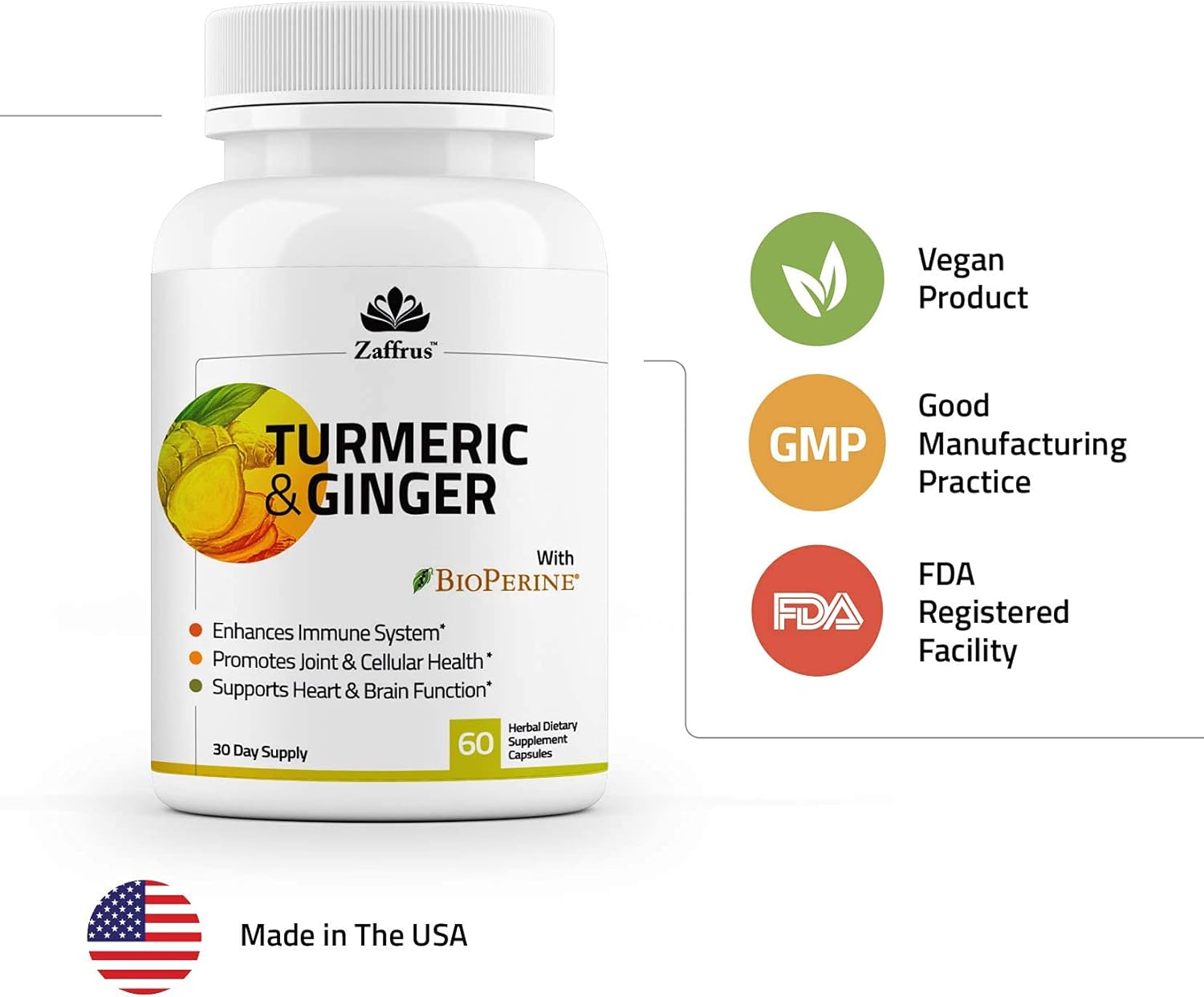 Zaffrus, Turmeric & Ginger with BioPerine is made from top quality all-natural ingredients. Each bottle contains 60 pills.