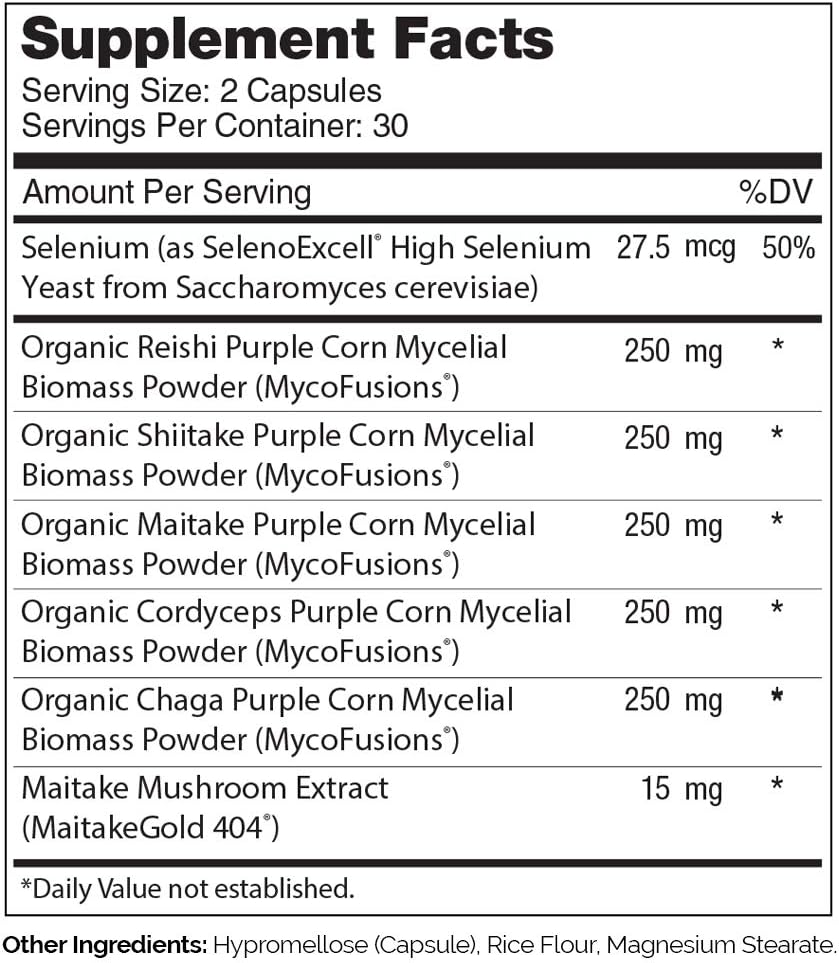 OPTIMAL FORMULA: Contains extracts and concentrations of five different mushroom species, as well as selenium to provide maximal gains.